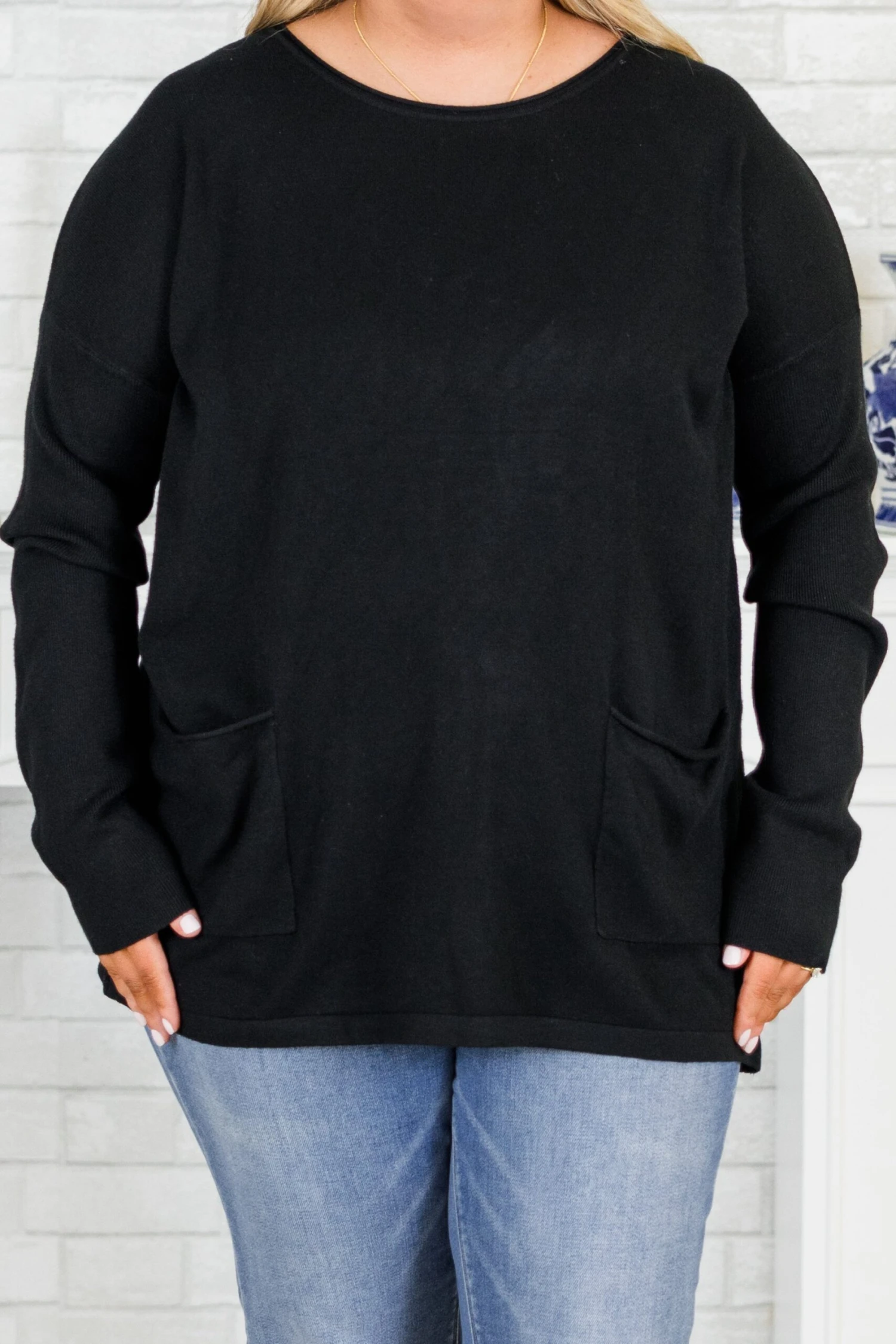 This sweater in black is a versatile addition to any wardrobe! With a round neck, front pockets, and ribbed sleeves, this basic sweater is both comfortable and stylish! Perfect for layering or wearing on its own, this sweater will keep you warm and on trend!