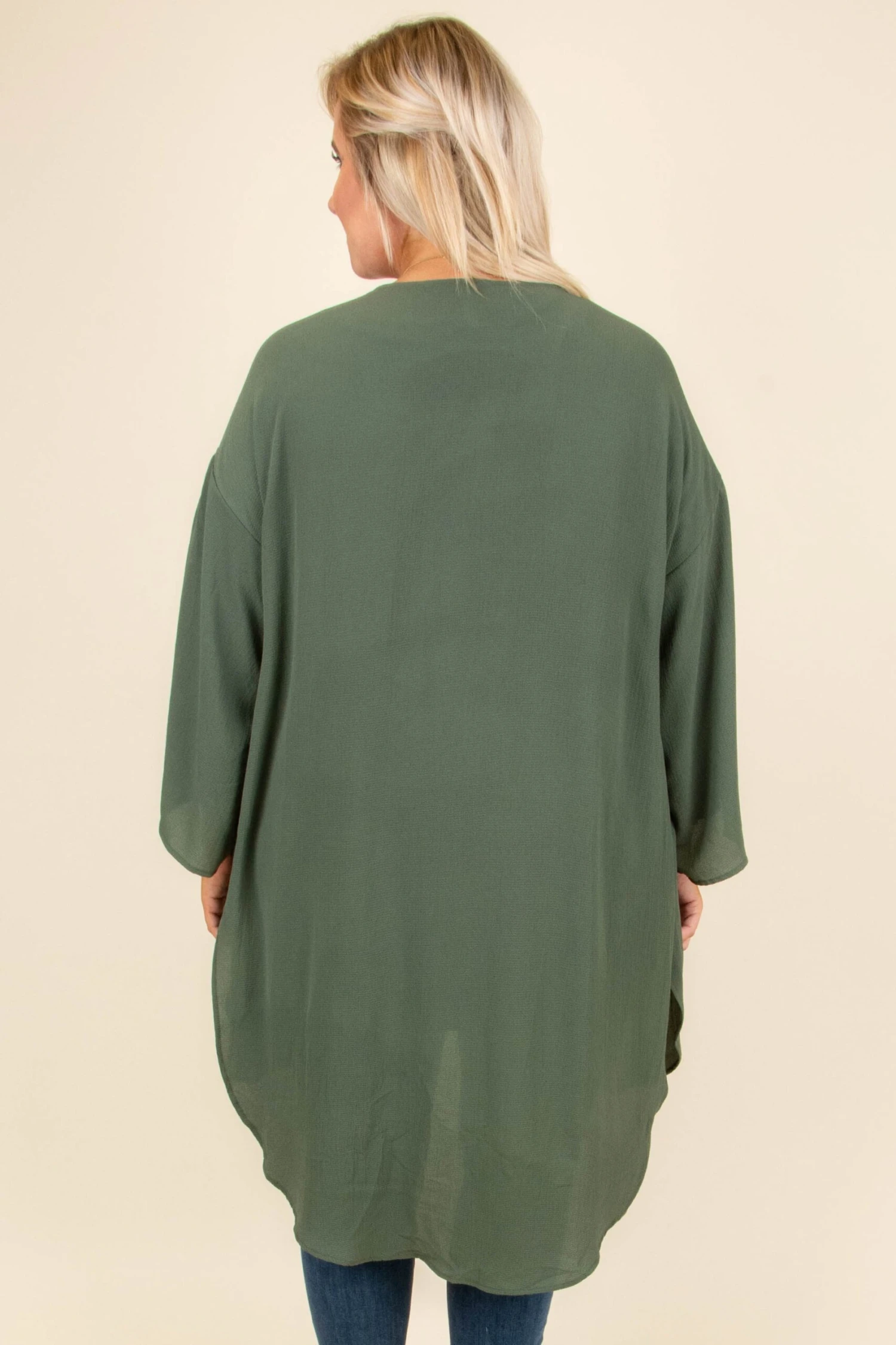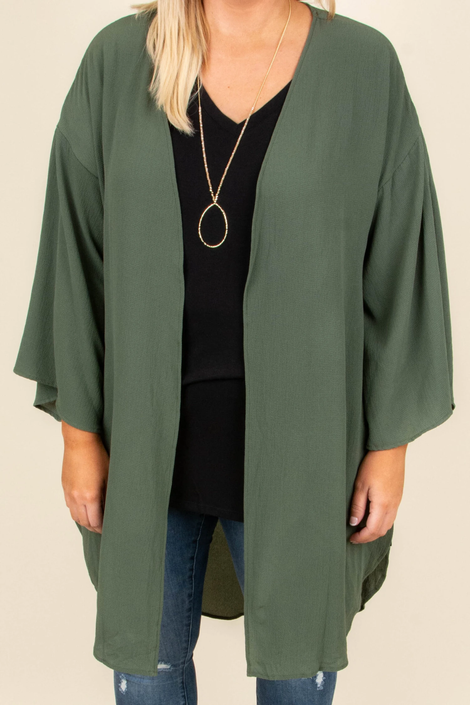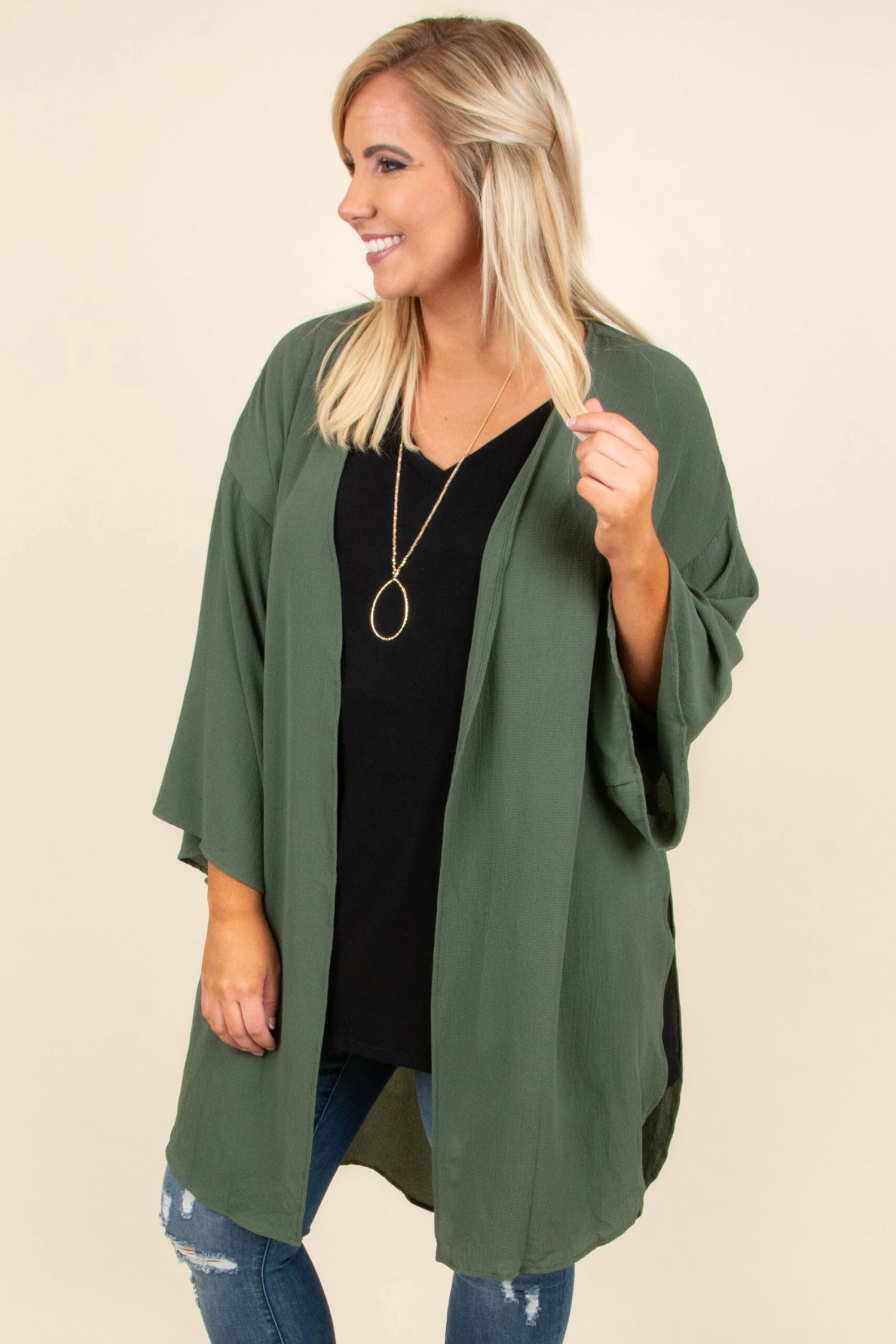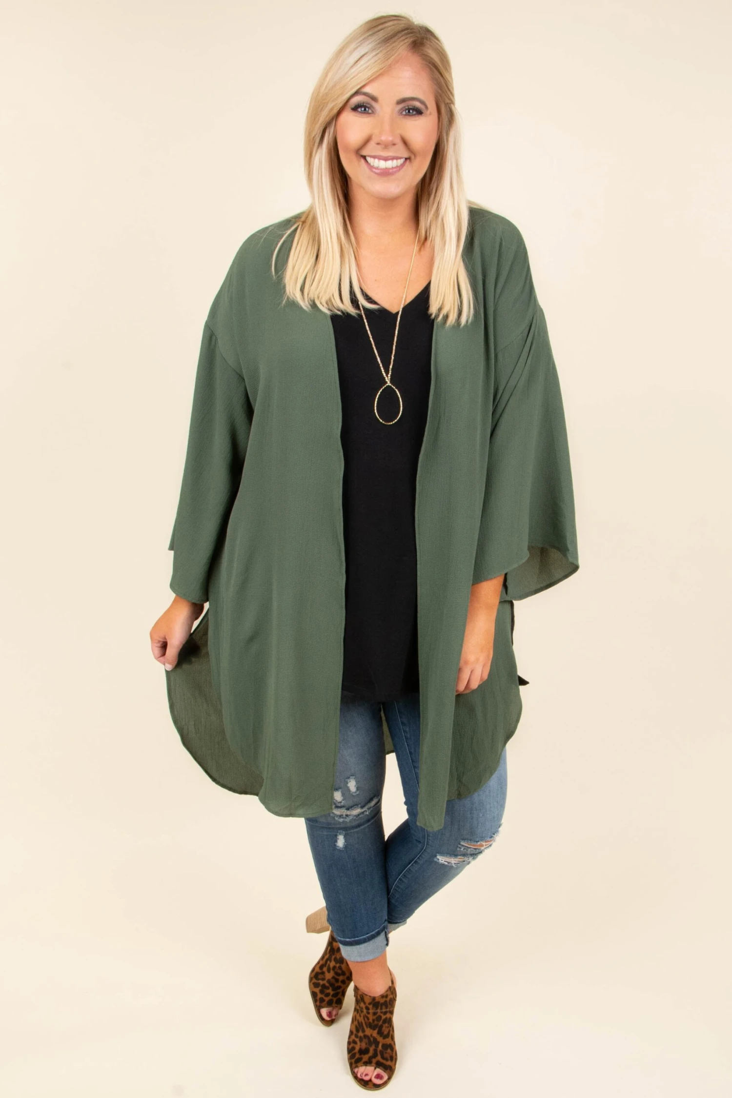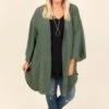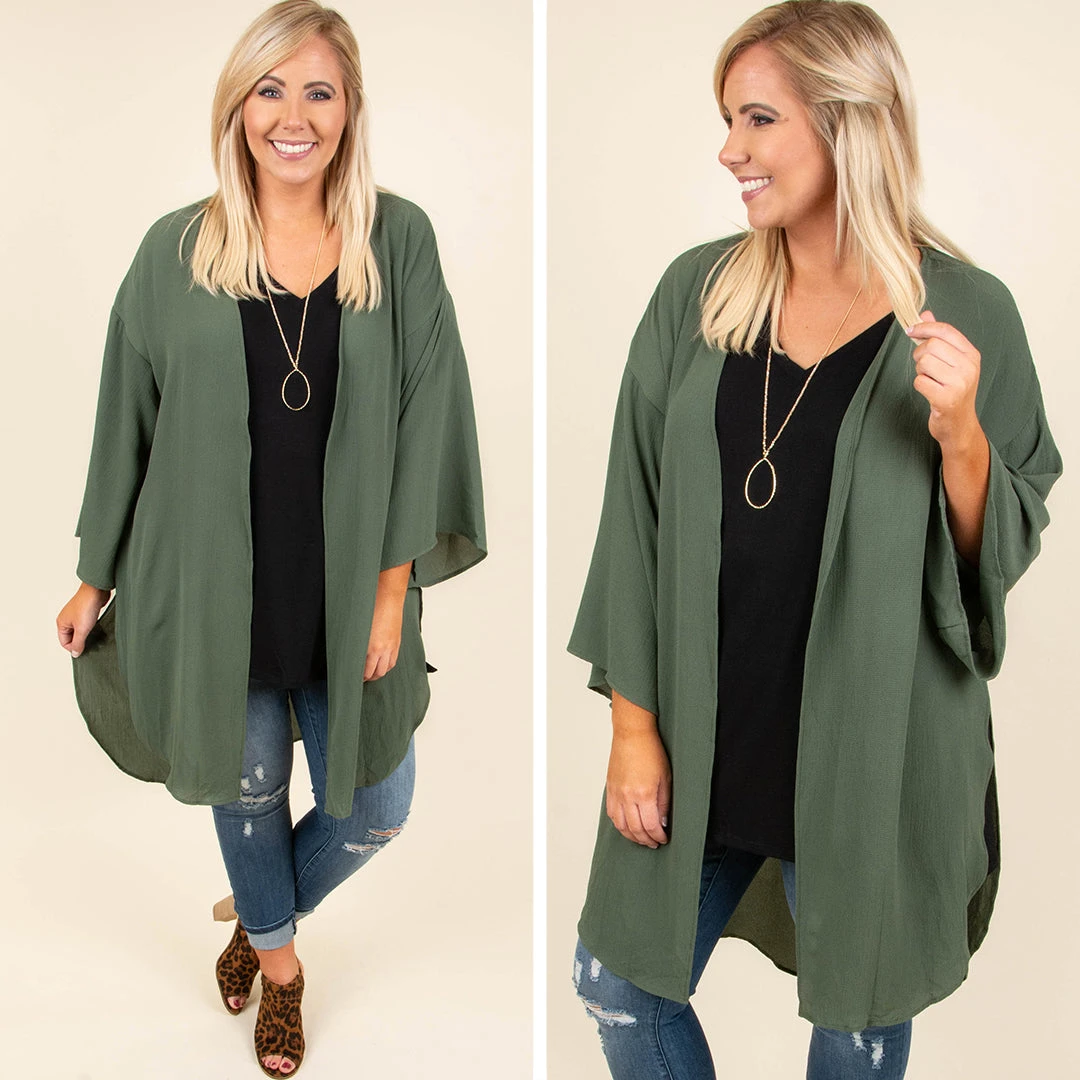 We’re a fan of having fun in this kimono! It has a bold olive color and a flowy, loose fit that makes it so easy to layer! It’s great for chilly Fall nights, too! Toss it on over a solid top and skinnies for a stylish outfit!