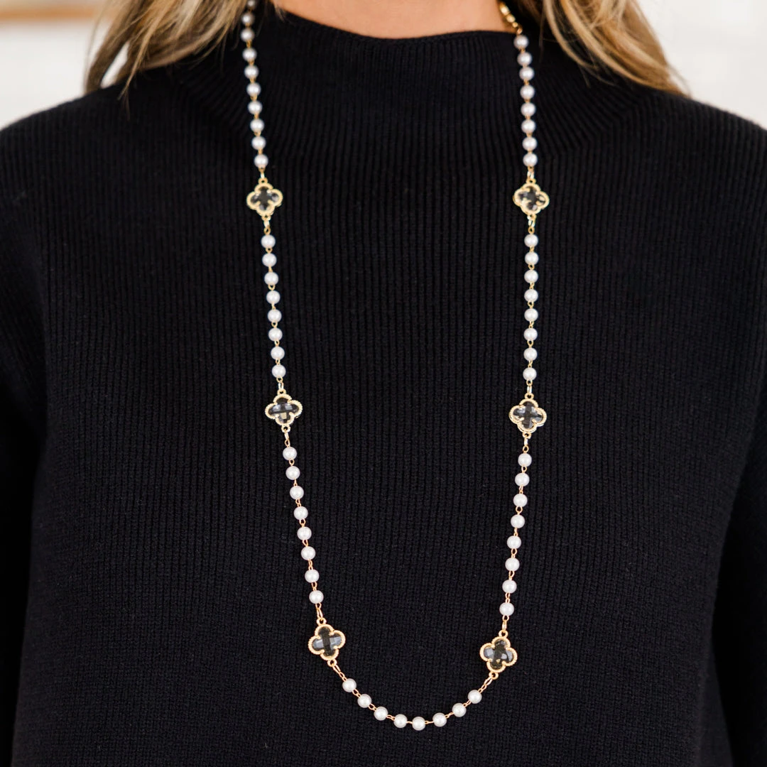 Experience the elegance of this necklace in stunning gold! Adorned with delicate pearl accents and intricate clover designs, this necklace is the perfect accessory for any occasion! Elevate your style and add a touch of sophistication with this beautiful piece!