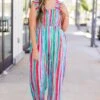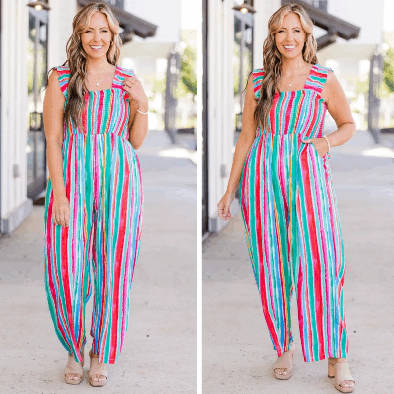 Get ready to stand out in this jumpsuit! The smocked bodice offers a comfortable and flattering fit, while the vibrant striped pattern adds a touch of unique style! Pair it with heels and accessories for a dressed up look, or keep it casual with fashion sneakers! You’ll love the versatility of this jumpsuit!