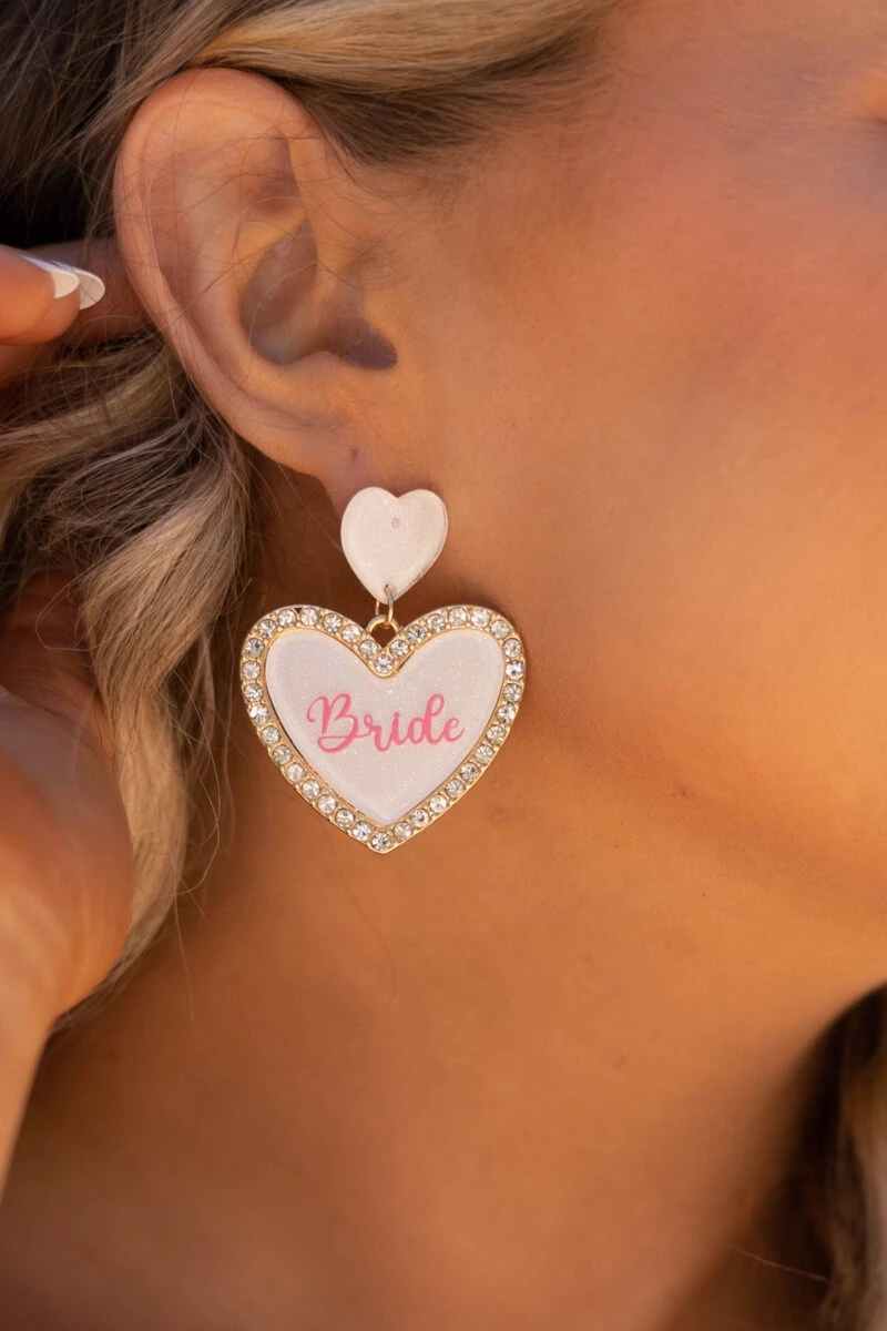 These stylish earrings will bring sophistication and romance to any bachelorette look! Crafted from polished white metal, these heart-shaped earrings are perfect for any bride-to-be! Pair them with all of your favorite outfits for a classy chic look!