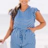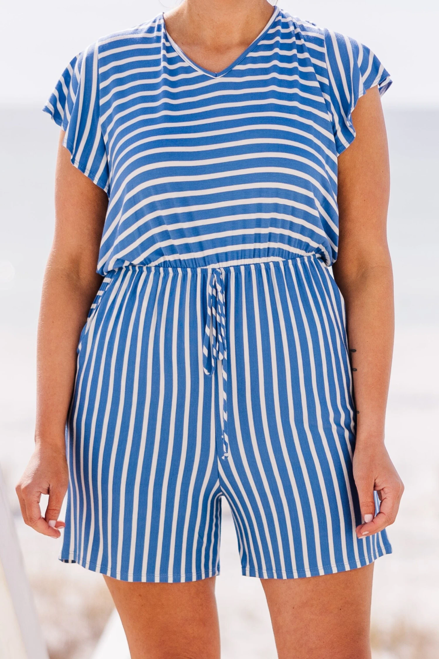 We feel just beachy about this adorable romper! The denim color is so sweet and the cinched waist is figure flattering! The flutter sleeves and stripe pattern is so fun! Style this with some heels and cute accessories for the ultimate chic look!