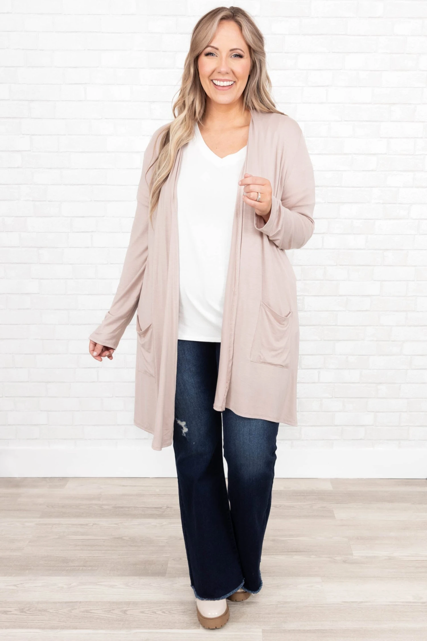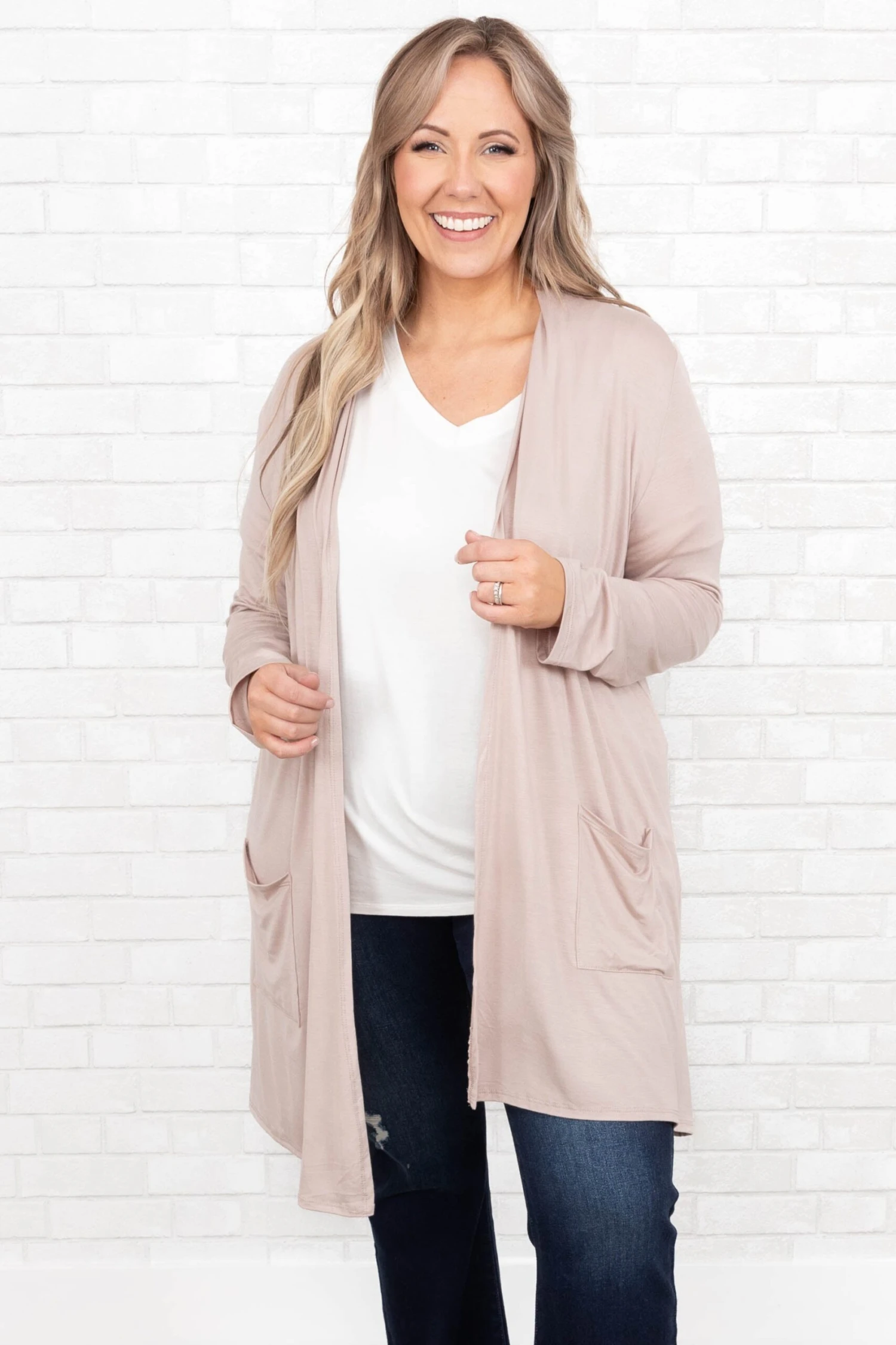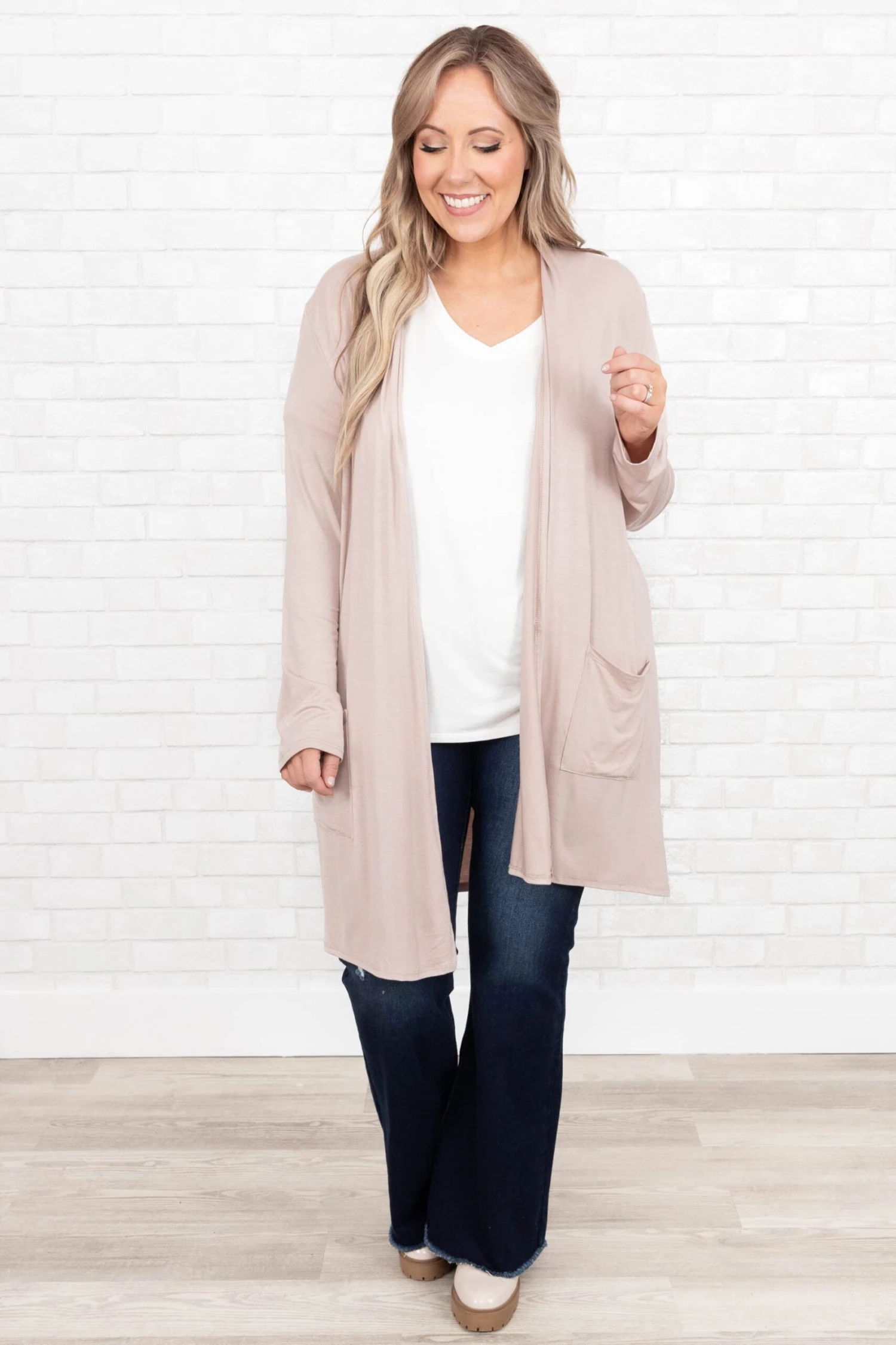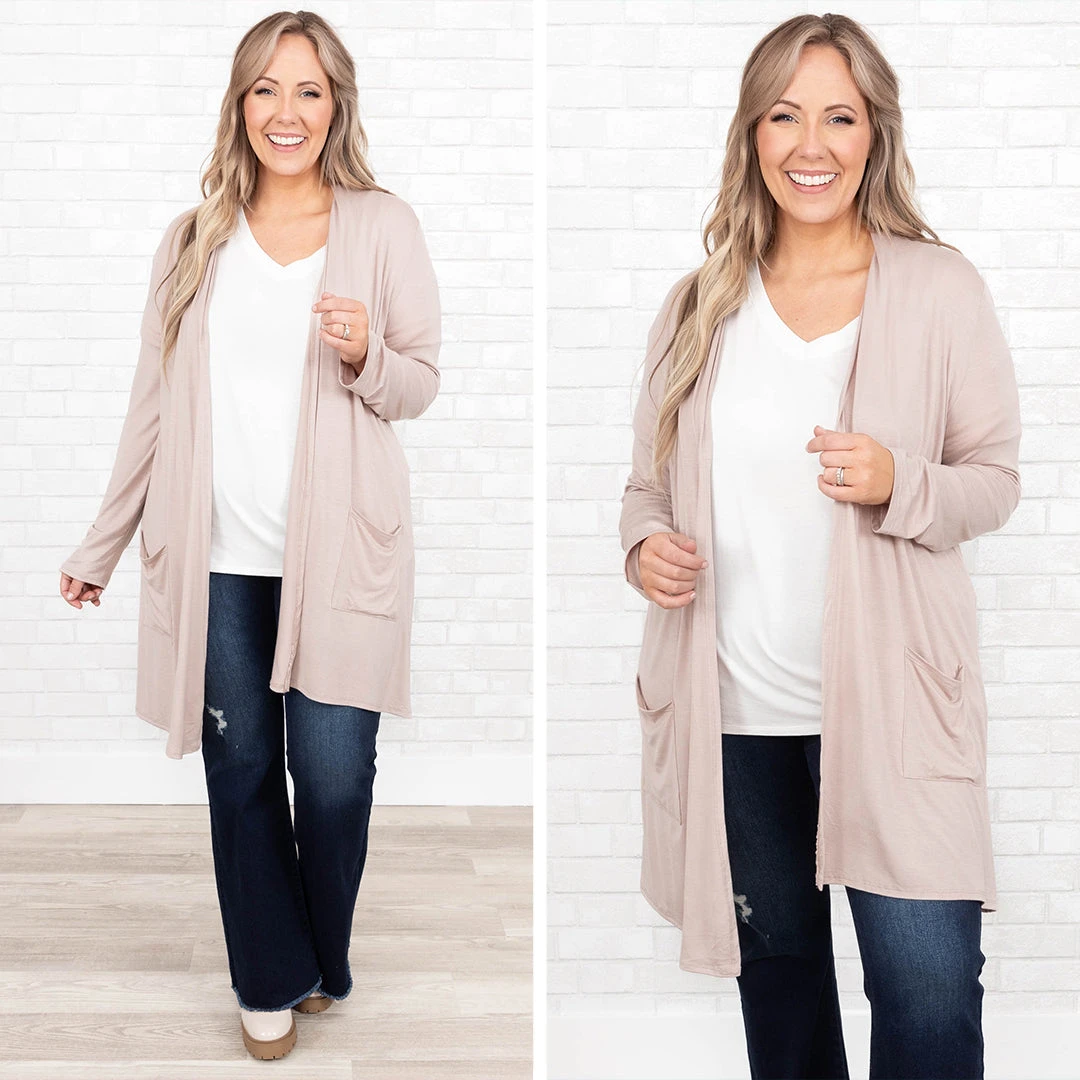 Let all your cares go in this cardigan!  It has a neutral taupe color you can dress up or down and style with everything in your wardrobe! It’s comfortable for all-day wear, has a relaxed fit to flatter your figure, and is perfect for the season! Simply style this cardigan with a solid or patterned top and skinnies for an effortlessly chic look!Â