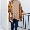 This poncho has us feeling wonderstruck! The neutral, taupe color with the trendy striped design and high neckline that is simply gorgeous! The flowy, cozy fit is perfect for the season! Style this poncho with jeggings and booties for a trendy chic look!