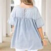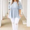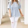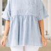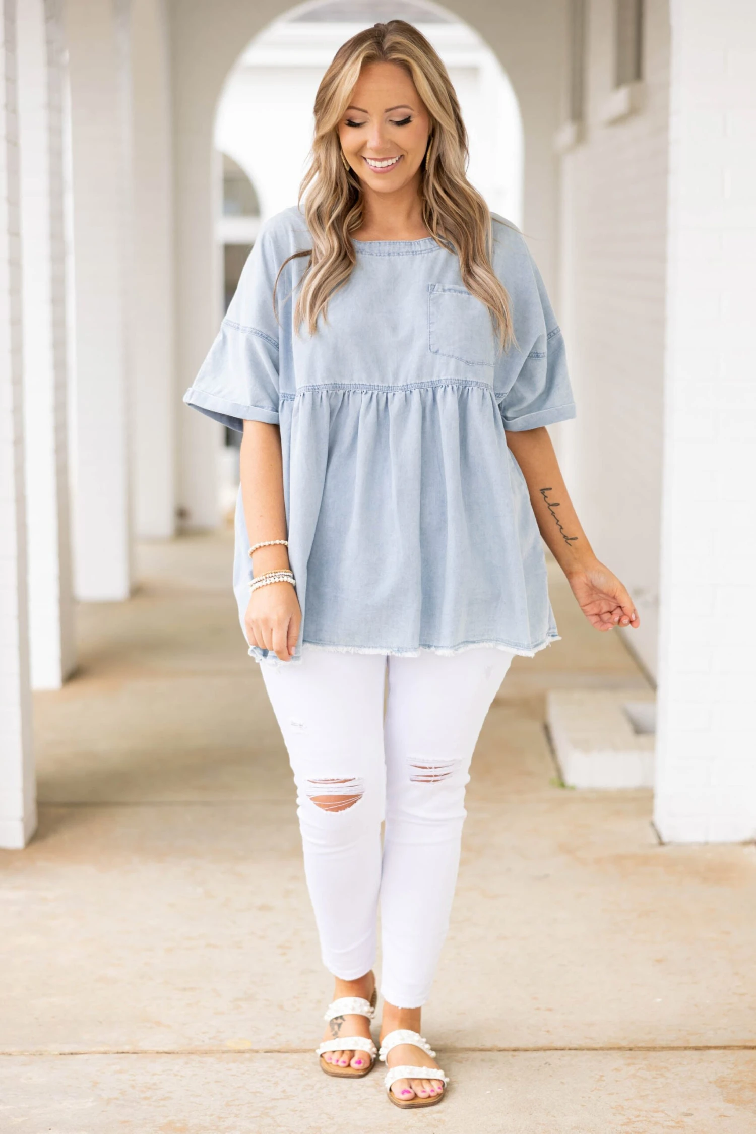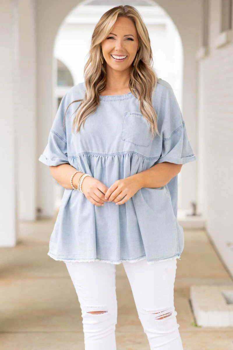 Add this beauty to your cart and find your way to the checkout! This top has a soft denim color with a trendy babydoll design that is so sweet! The frayed hemline and flowy fit is perfect for pairing with some white denim and sandals for a classy chic look!