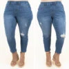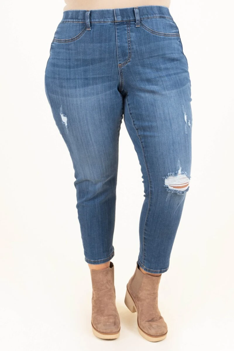 Get out and find new adventures in these comfy jeggings! These jeggings have a lovely dark wash and a trendy distressed pattern on the front! The stretchy, figure flattering fit is perfect for everyday wear! Style these jeggings with all your favorite tops and accessories for a classic, chic look!