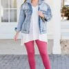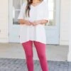 Always come in first in these leggings! The rose colored leggings have a comfy, stretchy fit and are a little high rise which makes them super flattering! Keep it casual with a chic top over them or throw a dress over them for a casual chic look!