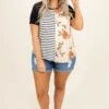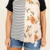 You will have so much fun in this top! We love the trendy block pattern with the neutral stripes and floral print. Style this babe with your fave jean shorts and sandals for the perfect look this season!Â