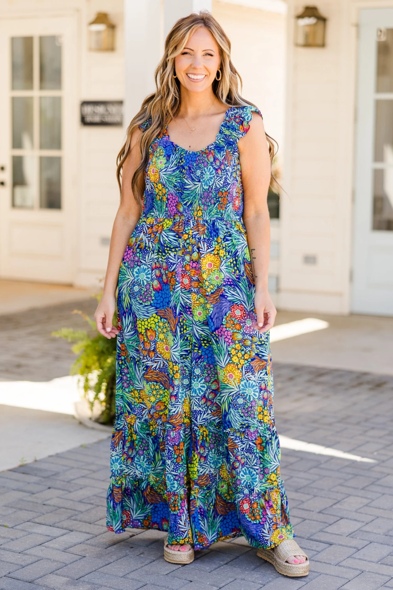 Add a flirty touch to your wardrobe! This jumpsuit in navy is both functional and fashionable! Featuring a smocked bodice, ruffle detailing, and functional pockets, it flatters every figure and adds a touch of elegance to any occasion!