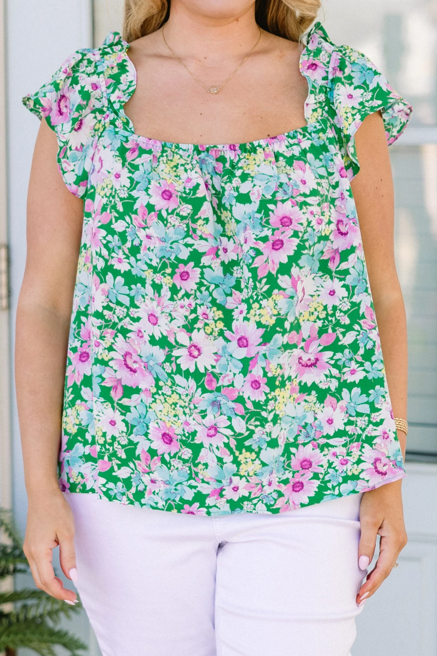 Add a touch of whimsy and charm to any occasion with this top! The delicate ruffle detail on the straps perfectly complements the vibrant floral print, while the square neckline adds a flattering touch! This top is sure to make you feel confident and stylish all day long!