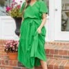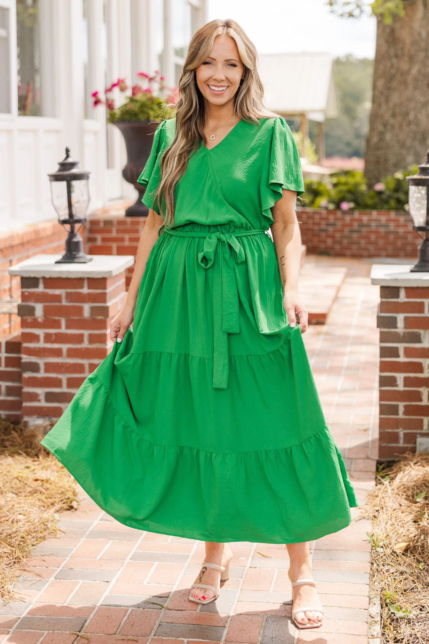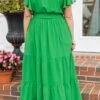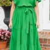 This dress will forever be in our hearts! The bold green color with the trendy waist tie is super sweet! Grab this beauty and wear it to a holiday party or even a date night! We see this dress paired with some heels and cute accessories for a sassy chic look!