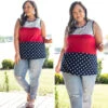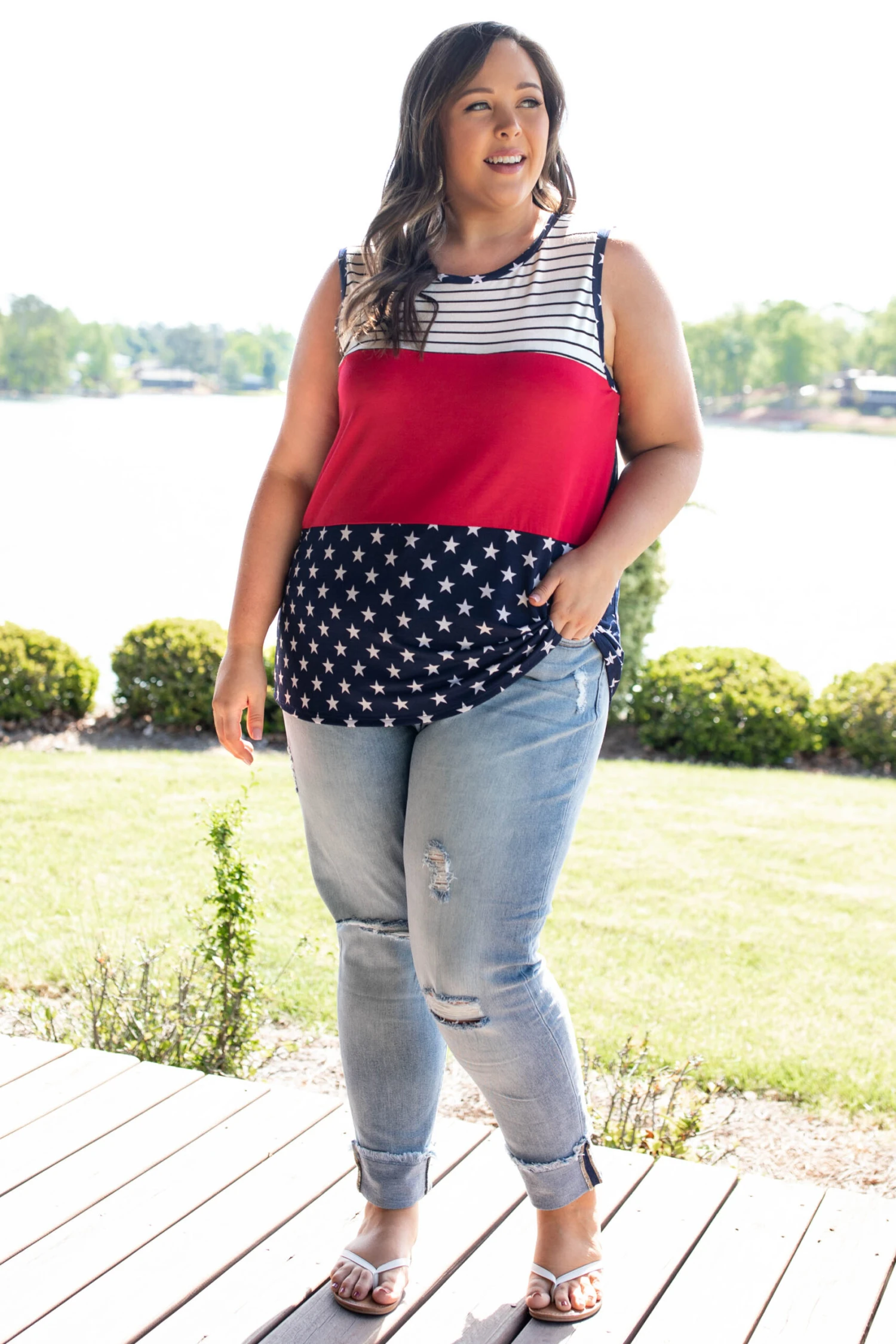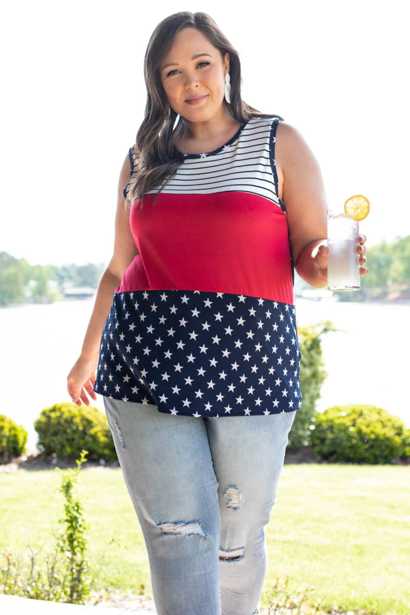 This tank was made for Summer! It has a trendy mix of stars and stripes with patriotic colors that are perfect for the season! It’s comfortable for all-day wear, has a figure-flattering fit, and can be styled with your favorite shoes and accessories! Style this tank with skinnies or shorts for an effortlessly chic look!Â
