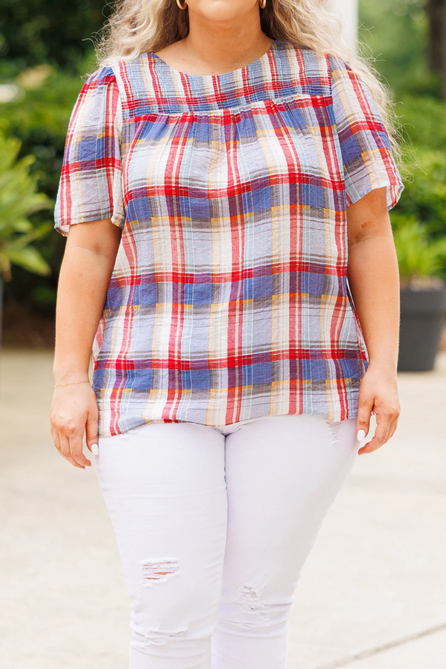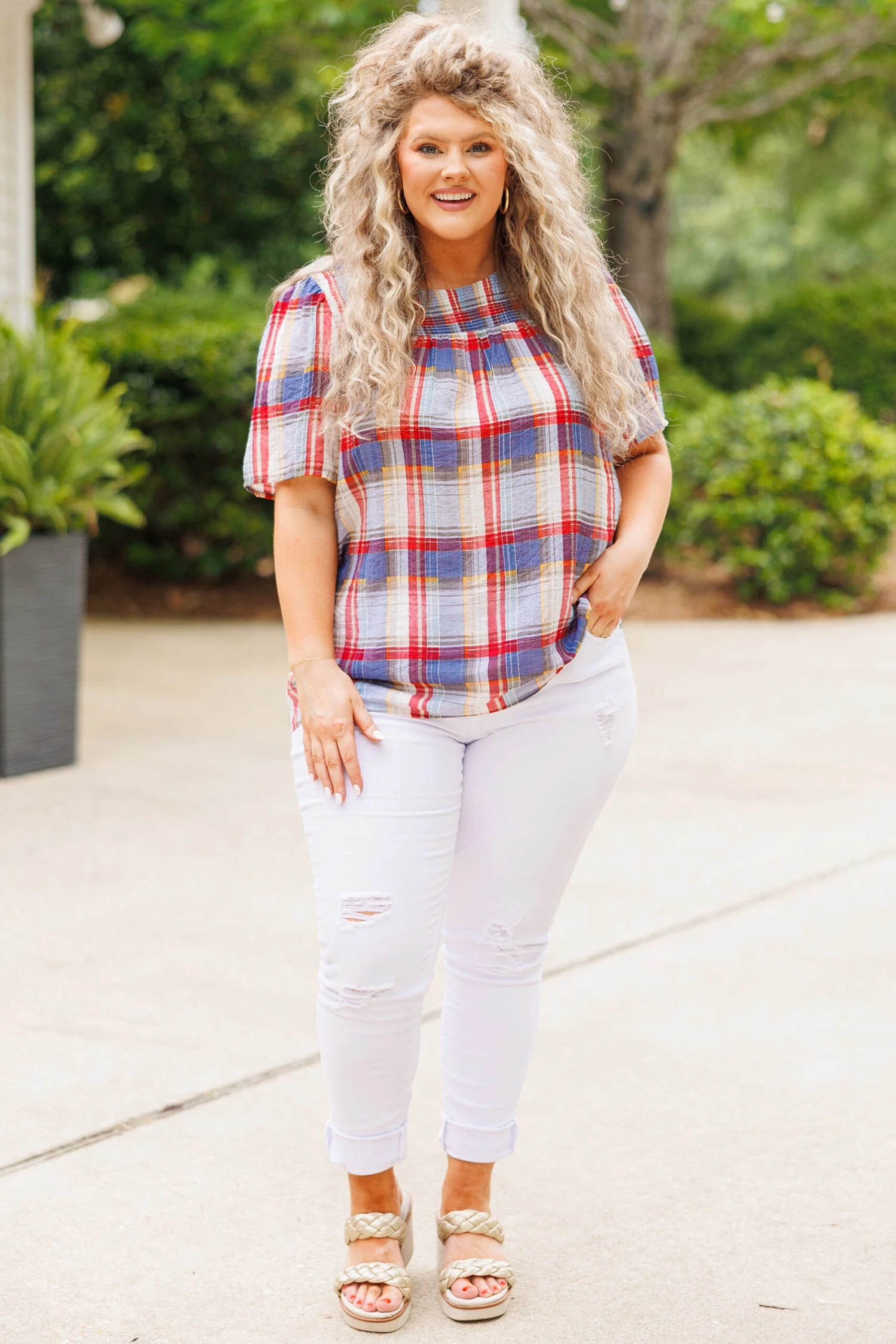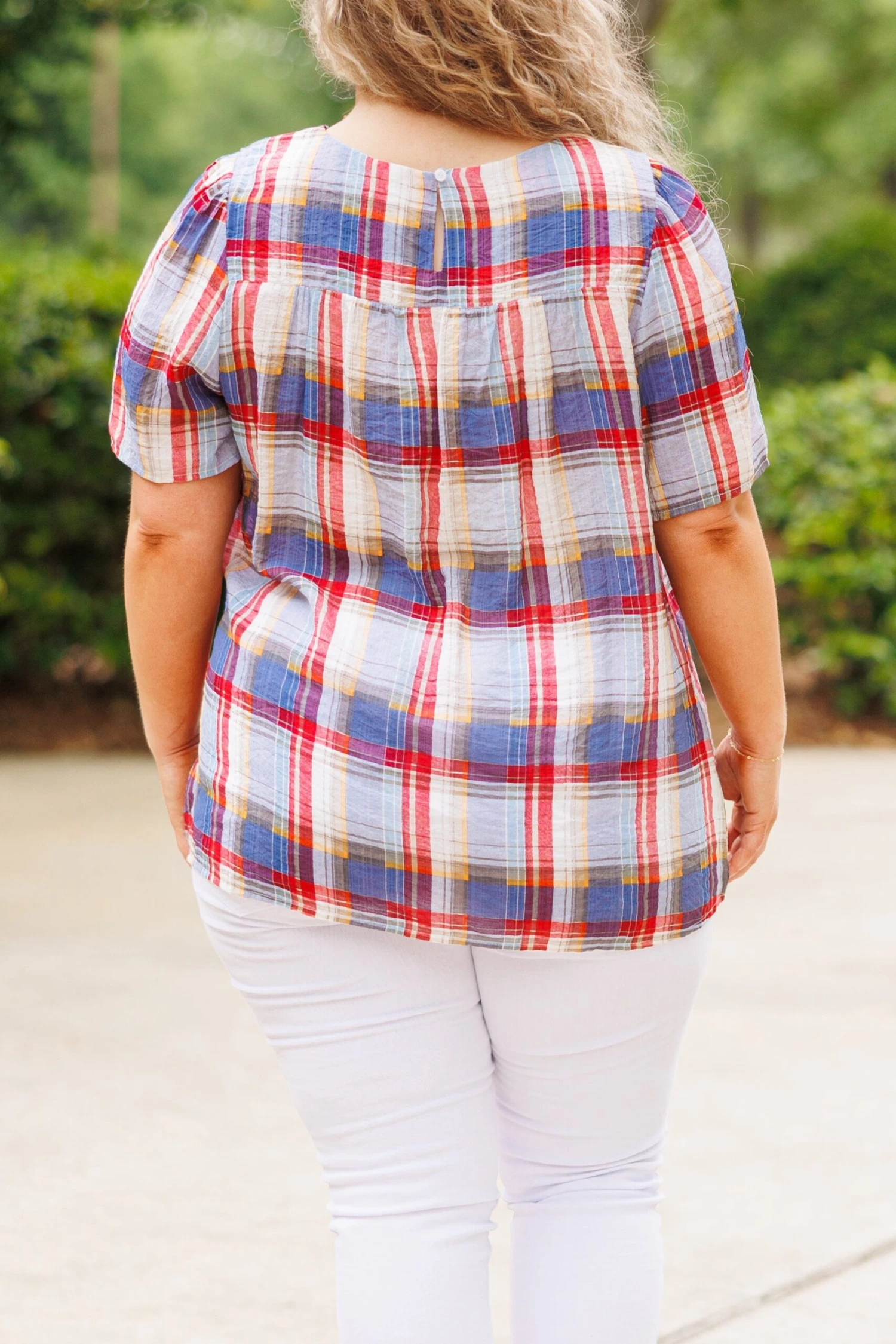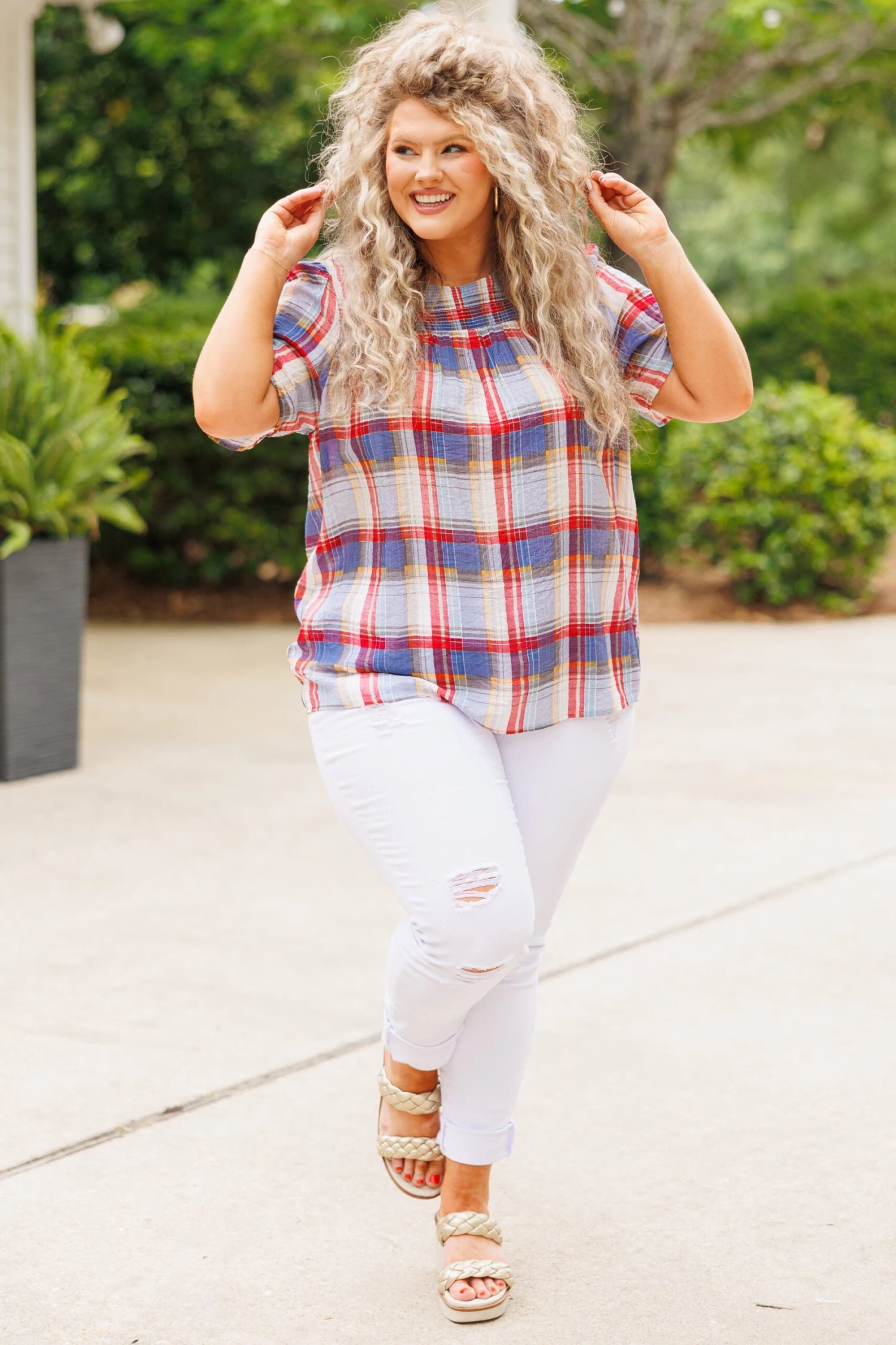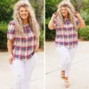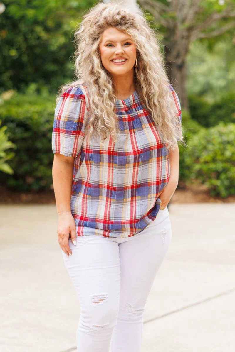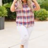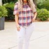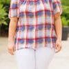 Let freedom ring in this FAB top! It is a navy and red plaid top that’s both comfortable and adorable! The light yet durable fabric is perfect for those who appreciate comfortable fashion! With its unique pattern, this top is perfect for a stylish and cozy look!