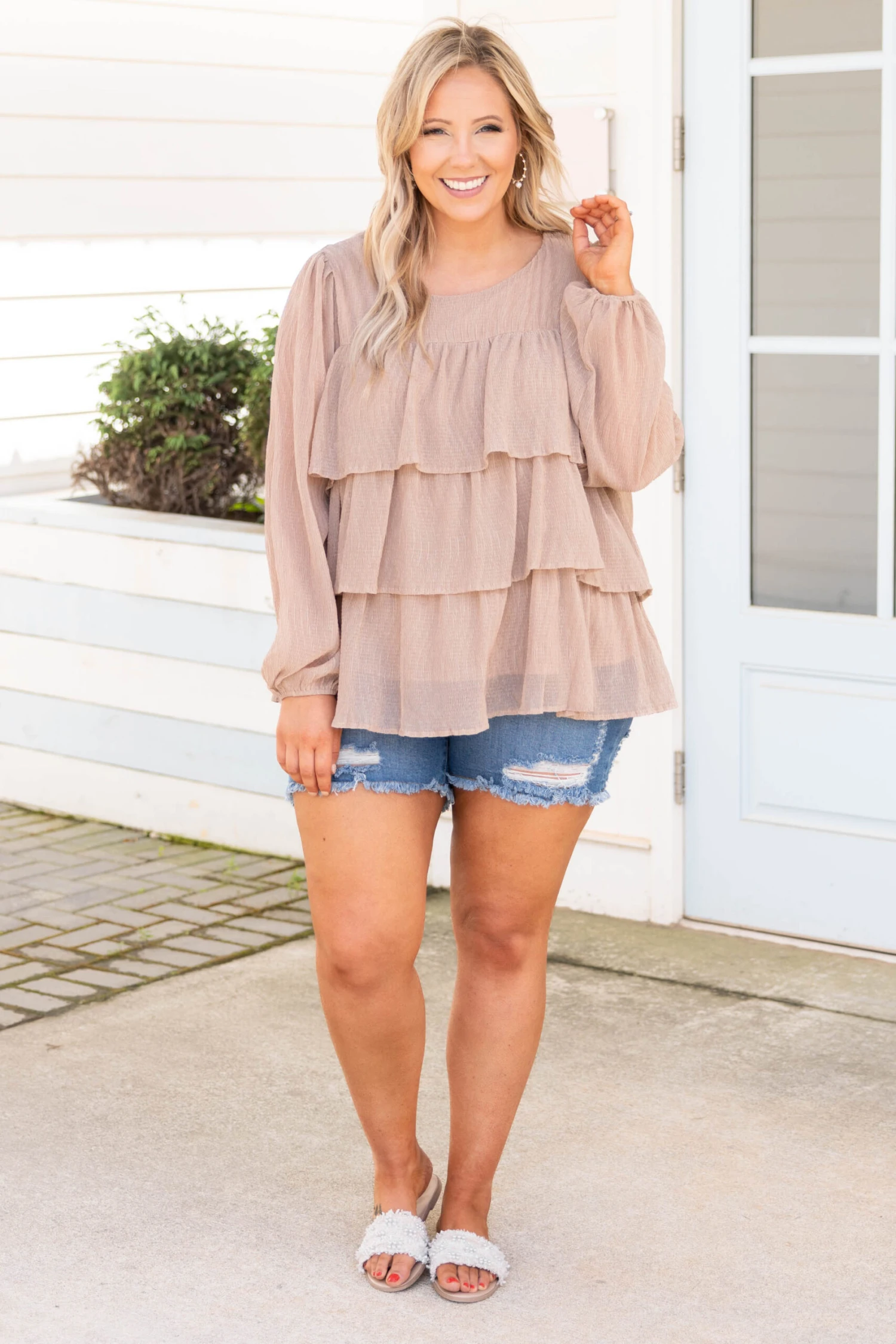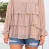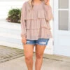 We love this top! It has a pretty mocha brown color you can dress up or down and style with everything in your wardrobe! It’s comfortable for all-day & night, has a relaxed baby doll fit to flatter your figure, and features the cutest ruffled fit! Simply pair this top with shorts and sandals for an effortlessly chic outfit!Â