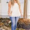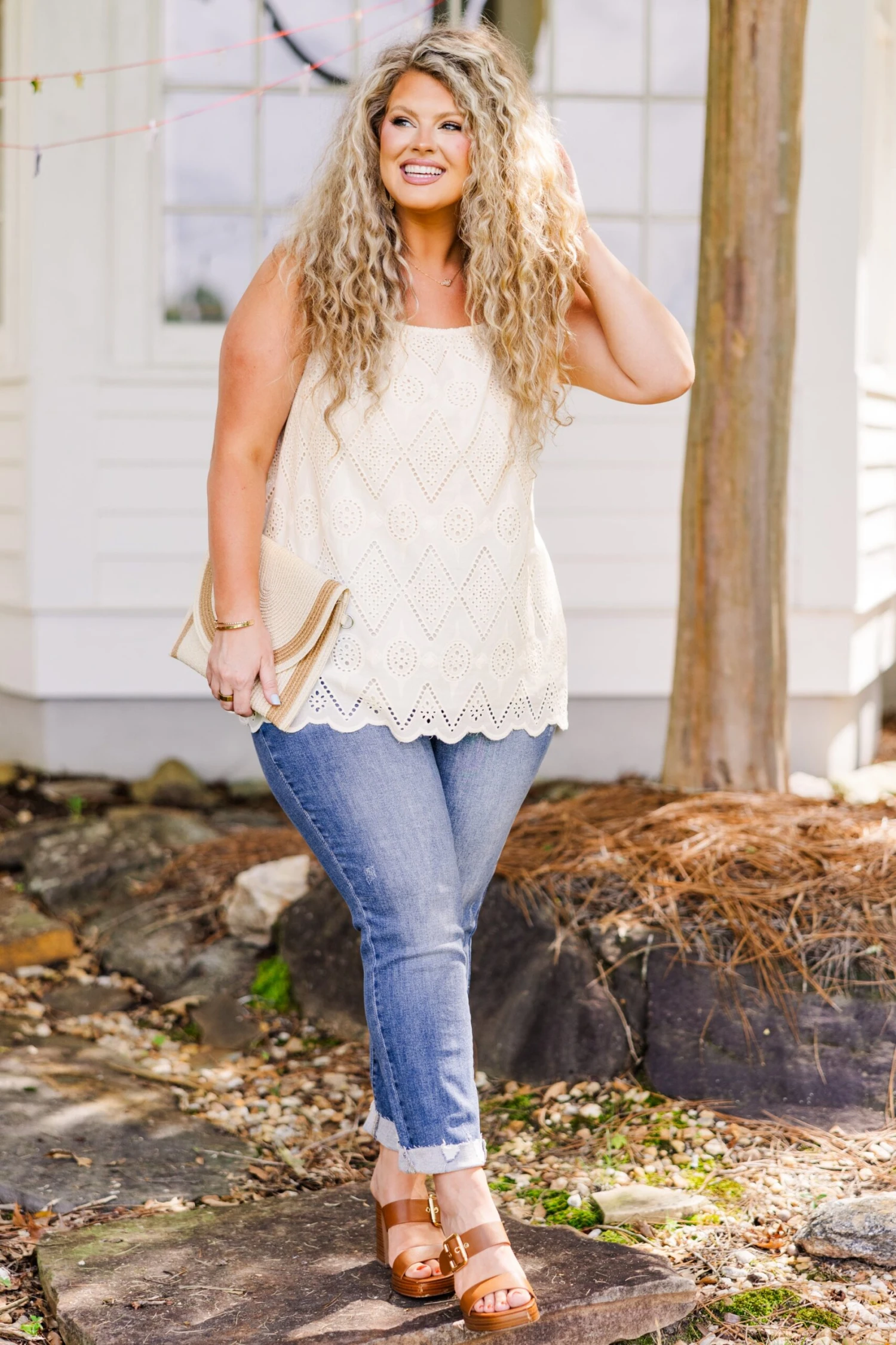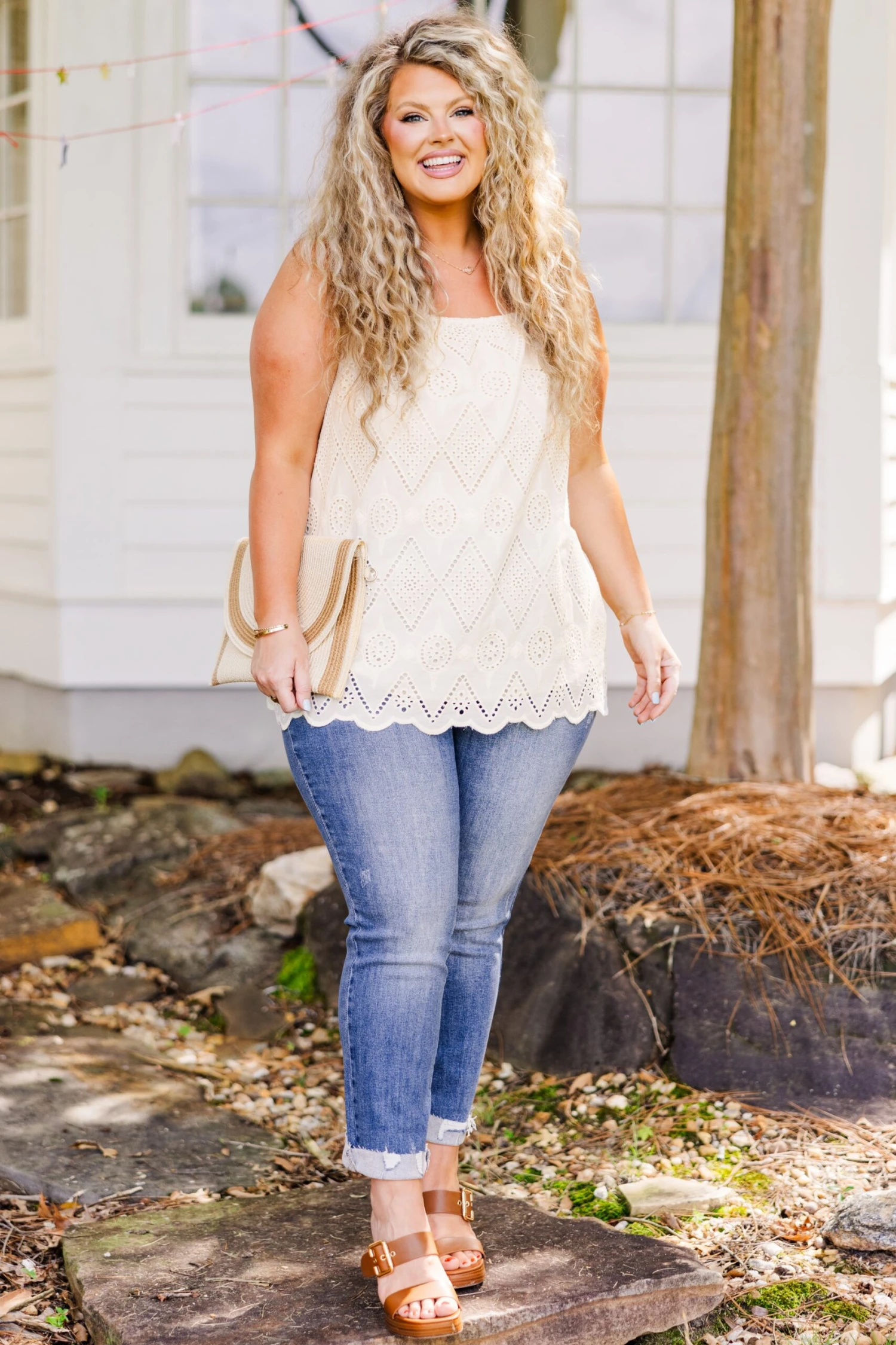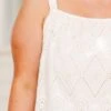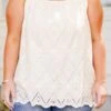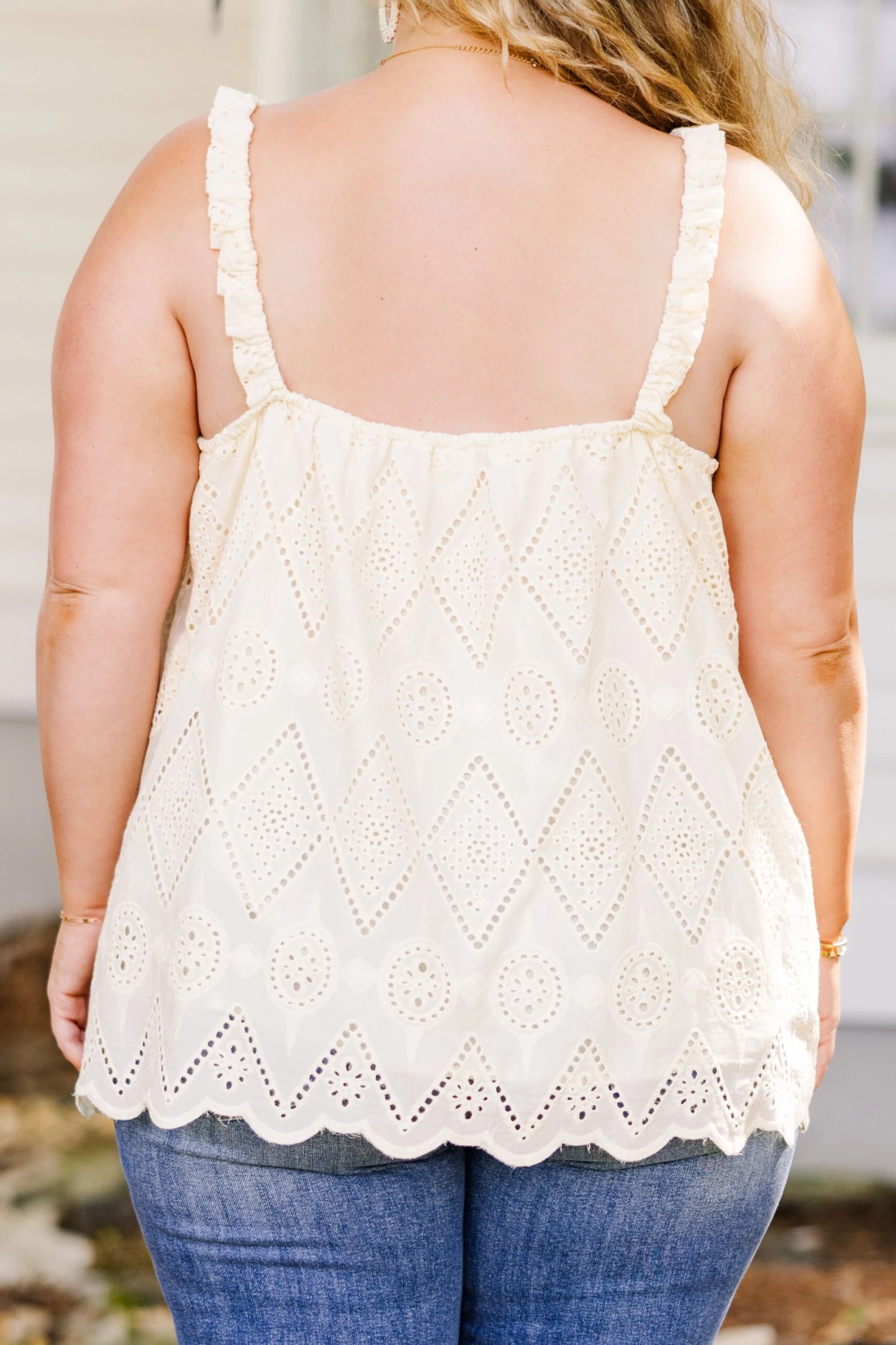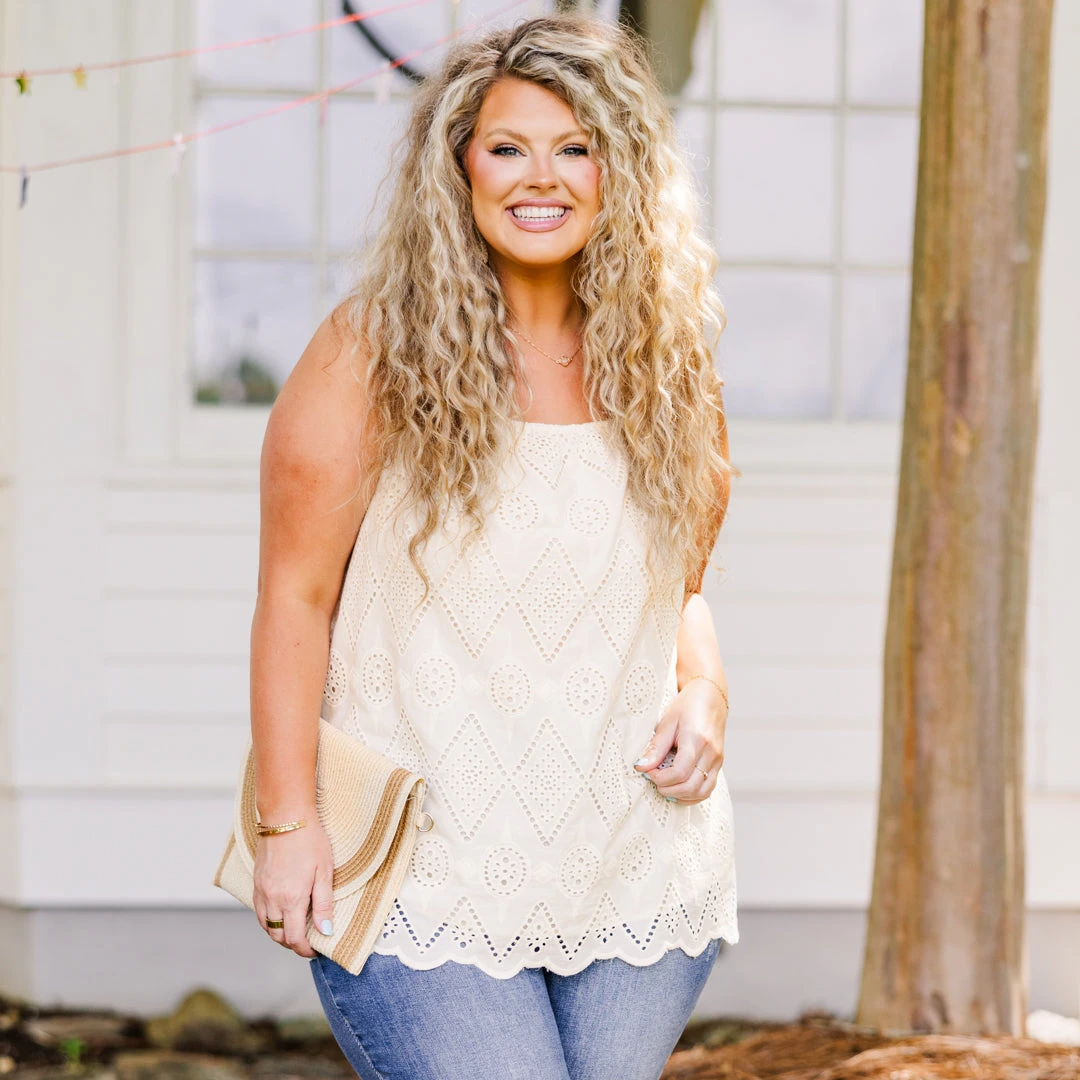 This tank in natural is sure to bring a smile to your face! With its delicate scalloped hemline and eyelet detail, this tank is both feminine and playful! The elastic straps provide a comfortable and adjustable fit! Perfect for adding a touch of happiness to any outfit!