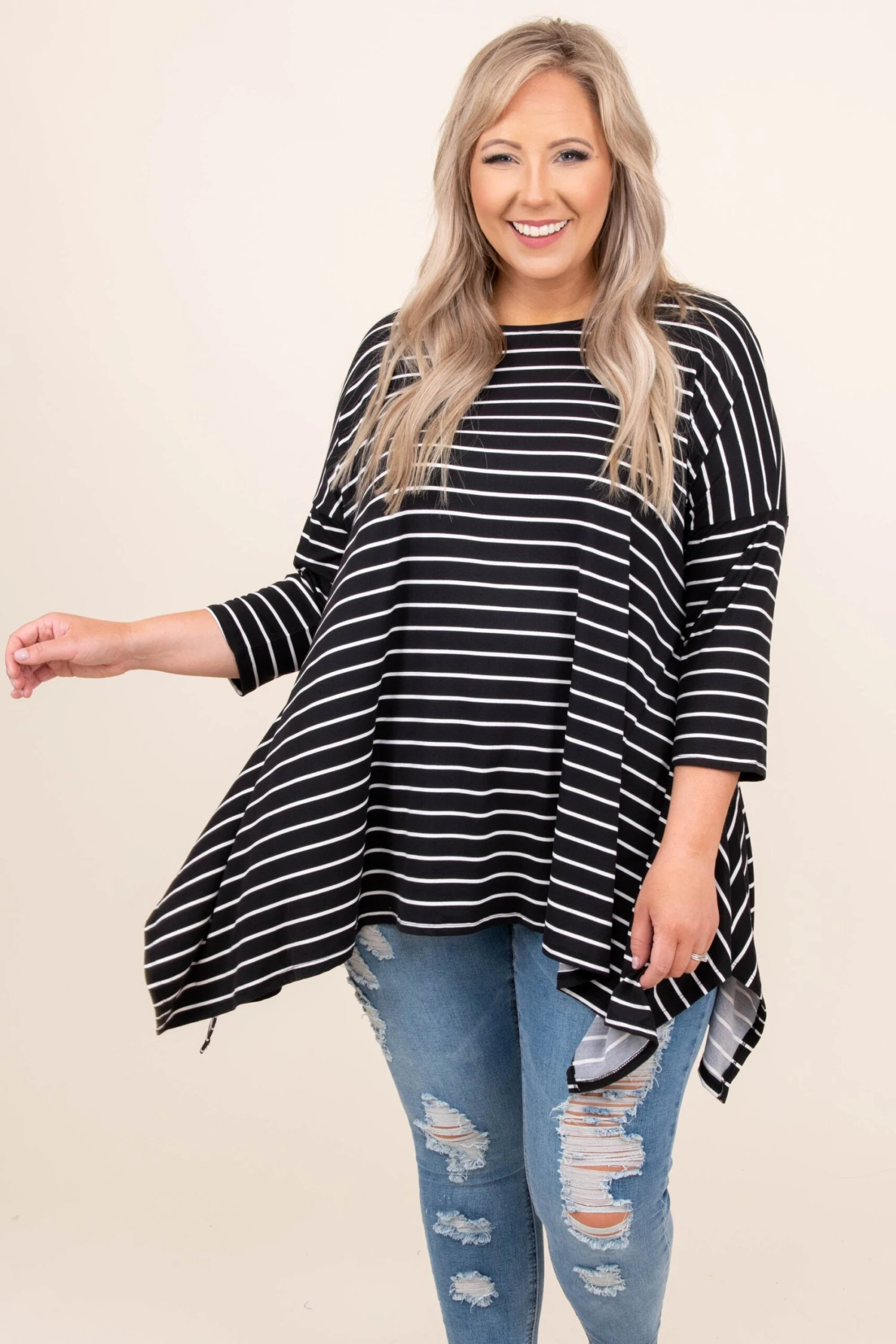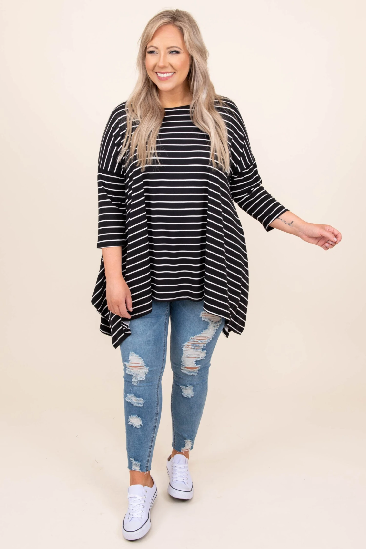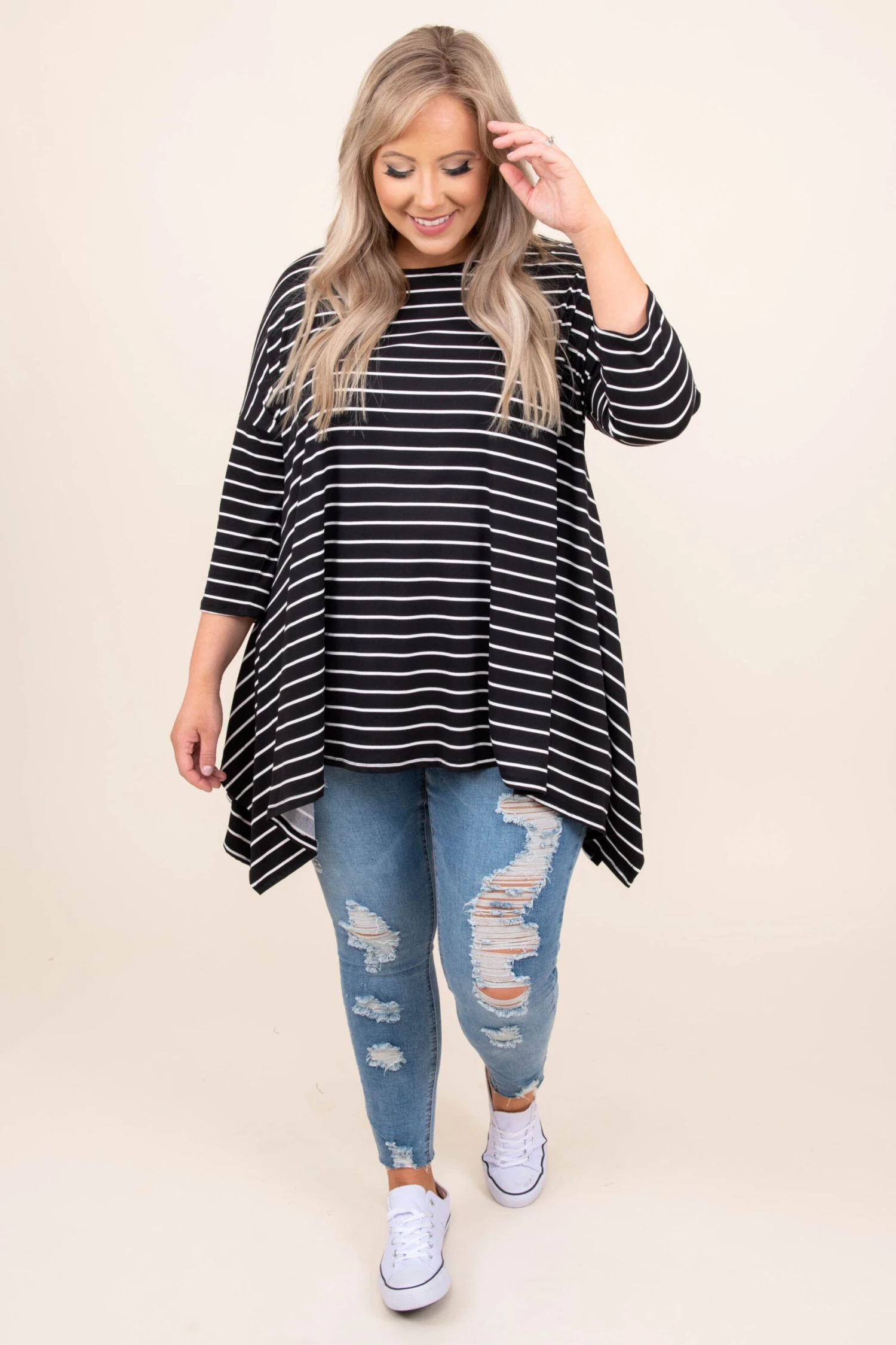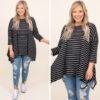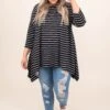 This top is made for fun times! This top has a trendy striped pattern with neutral colors you can style for every occasion! Its soft fabric will keep you comfortable all day long, while the relaxed fit and a shark bite hemline detail will flatter your figure in the best way! Wear this tunic with skinnies or leggings for an easy everyday look!