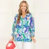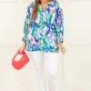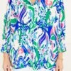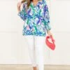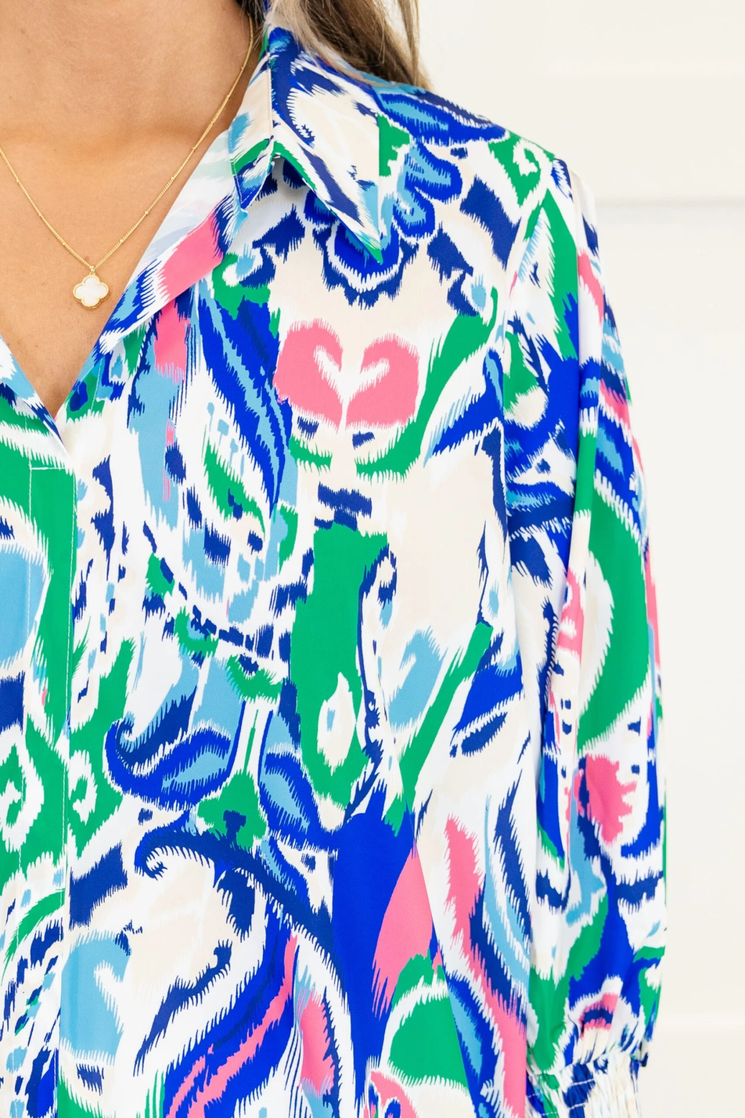 Add a playful touch to your wardrobe with this top in blue! Featuring a colorful abstract print and a split v-neck with a collared design, this top is perfect for any outing! The smocked cuff sleeves add a fun and unique detail to this stylish top! Get ready to stand out in style!