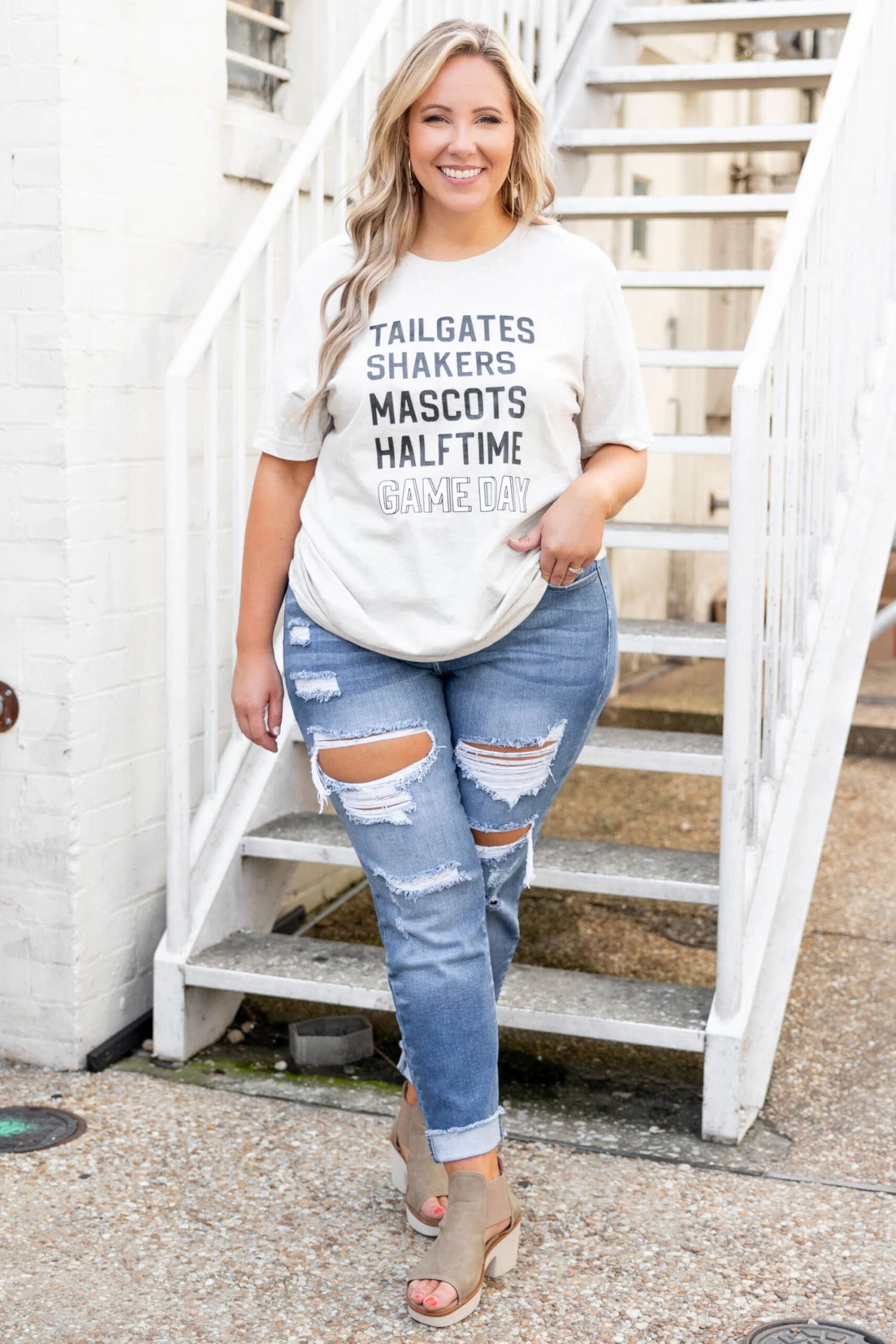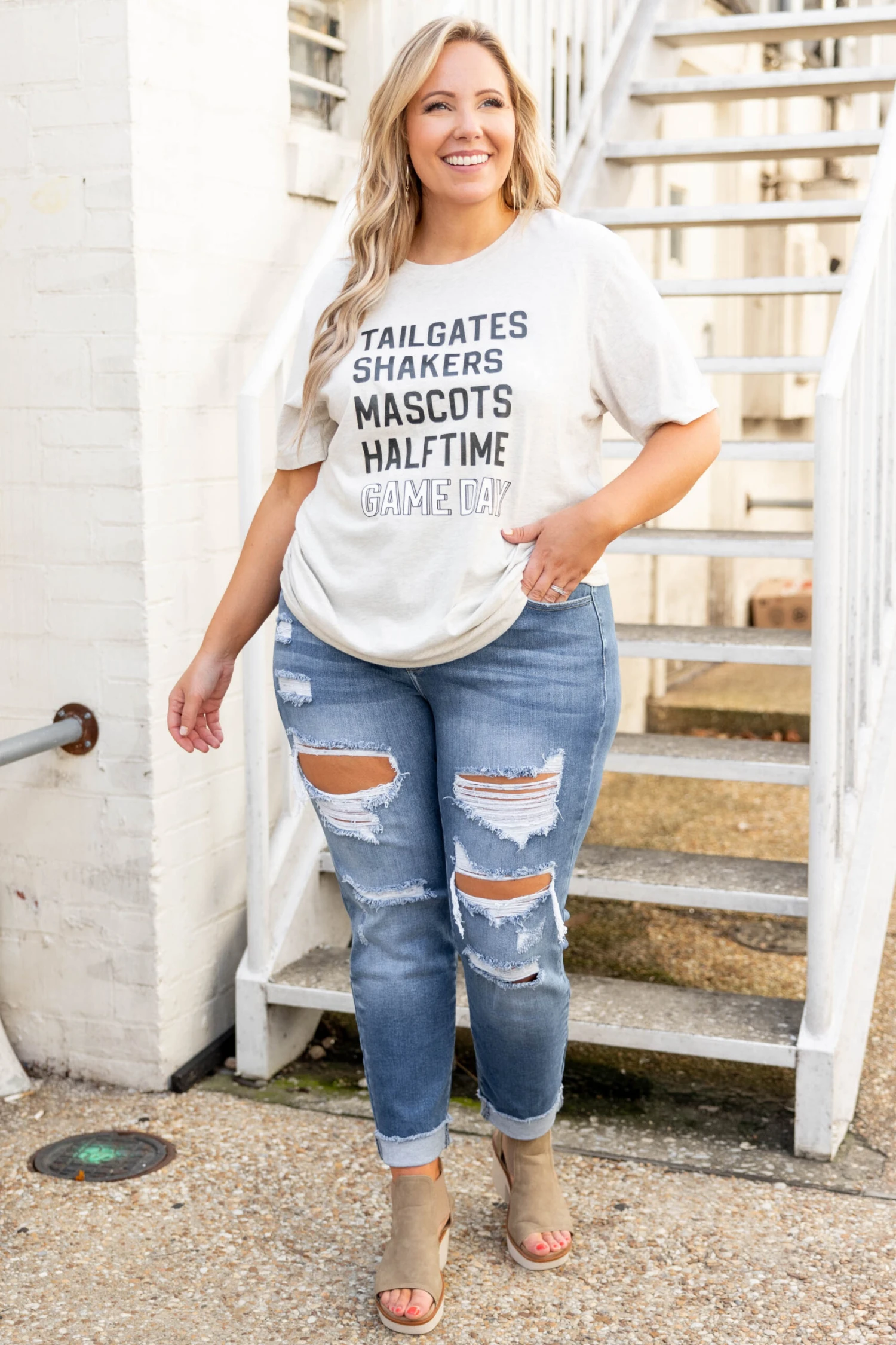 This gorgeous tee is a gameday essential! This tee has a cute graphic with some of the things we love most about the season! The figure flattering fit and stretchy material are the perfect combo for game day! Simply style this tee with some skinnies and heels for a classic, chic look!Â