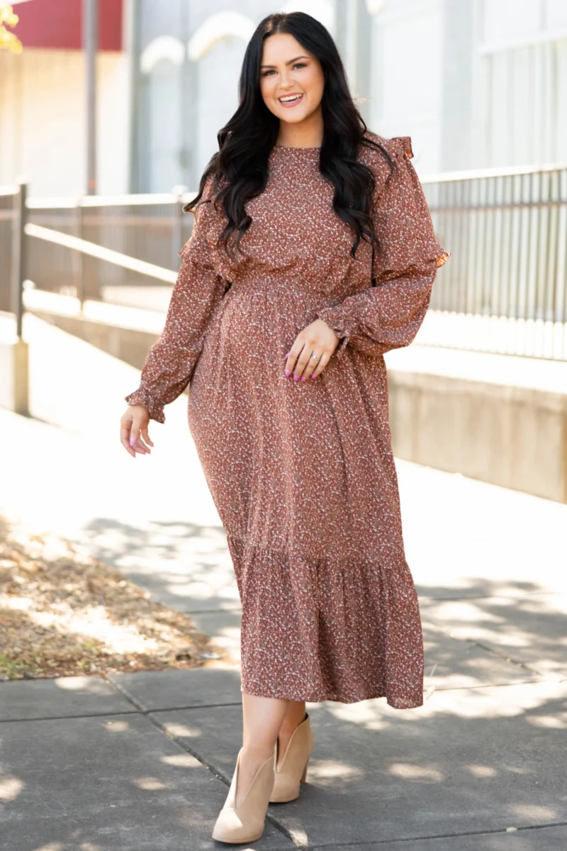 The beauty is this dress is beyond our wildest dreams! This dress has a soft brown color with a gorgeous floral print that is perfect for the season! The ruffles along the sleeves, bodice and hemline are super sweet! The flowy, figure flattering material is perfect for any occasion! Style this dress with some booties and accessories for a sassy chic look!