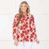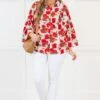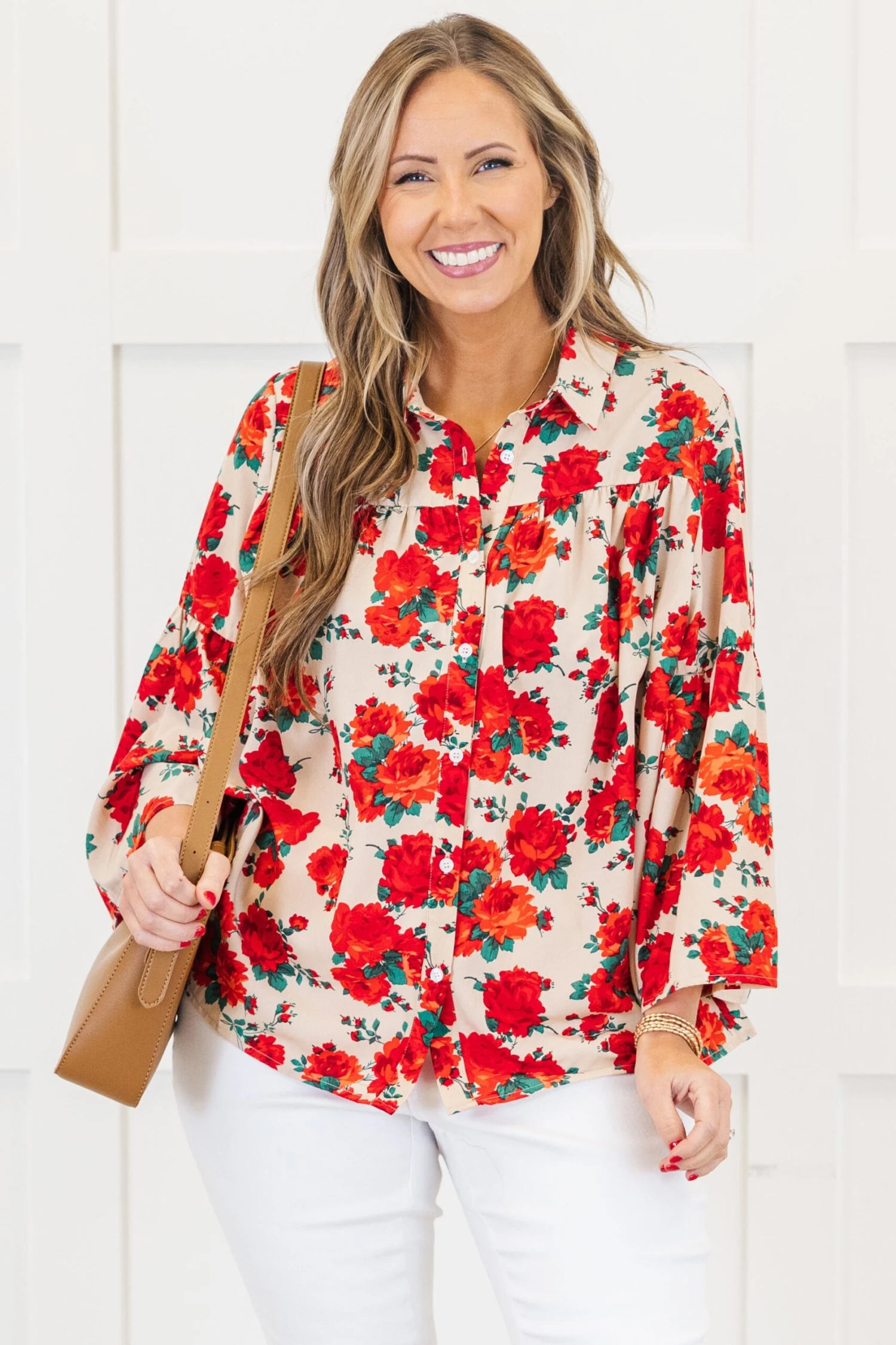 Spruce up your wardrobe with our Garden Party Blouse in red-beige! This playful button down top features charming florals, statement bell flare sleeves, and a classic collared neckline! Perfect for adding a touch of whimsy to your outfit!