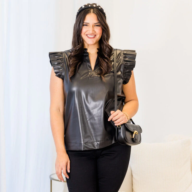 Elevate your style with this luxurious top in black! The faux leather bodice and ruffle shoulder design adds a touch of sophistication, while the split v-neckline offers a subtle hint of allure! Perfect for a night out or adding a touch of luxury to your everyday look!