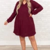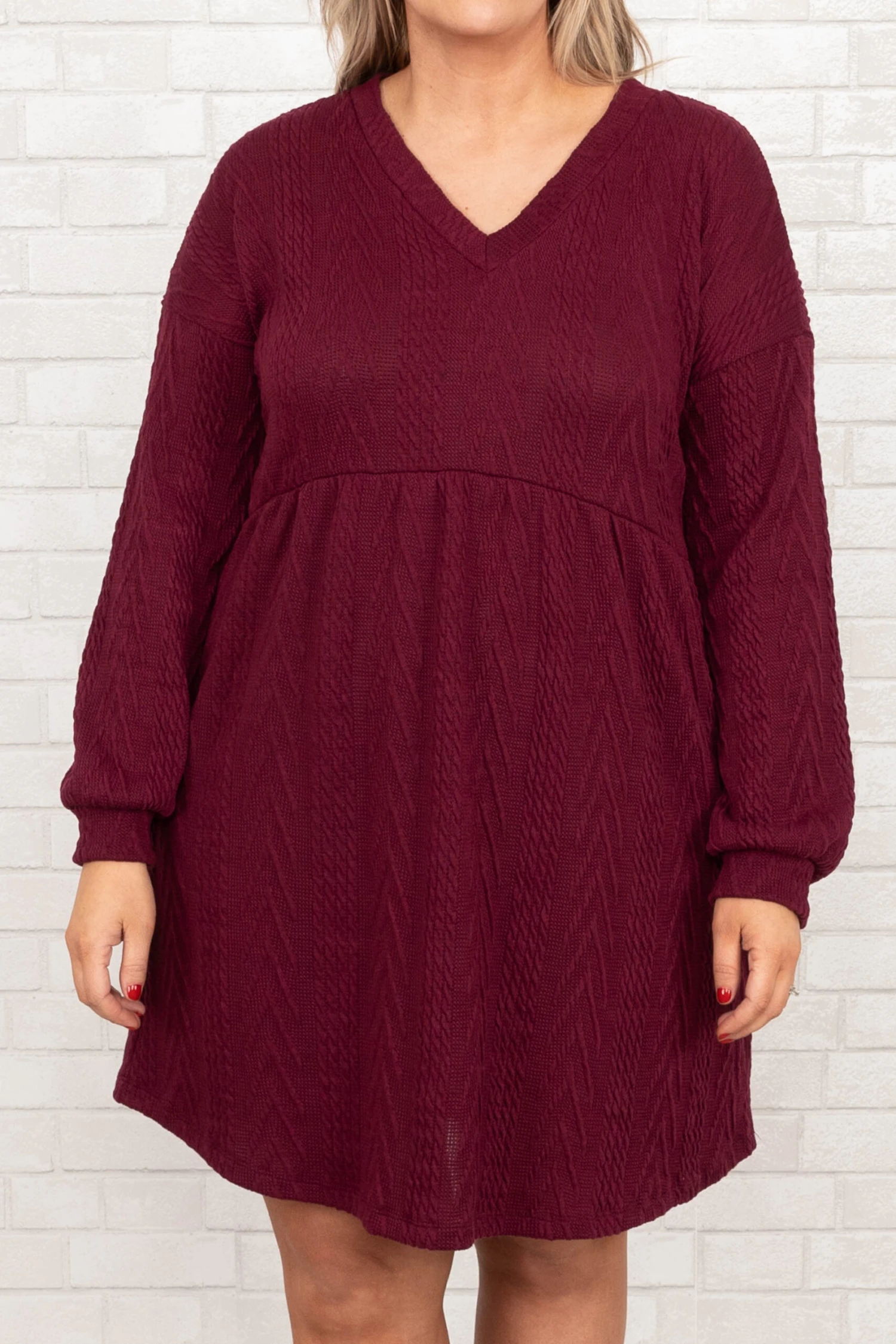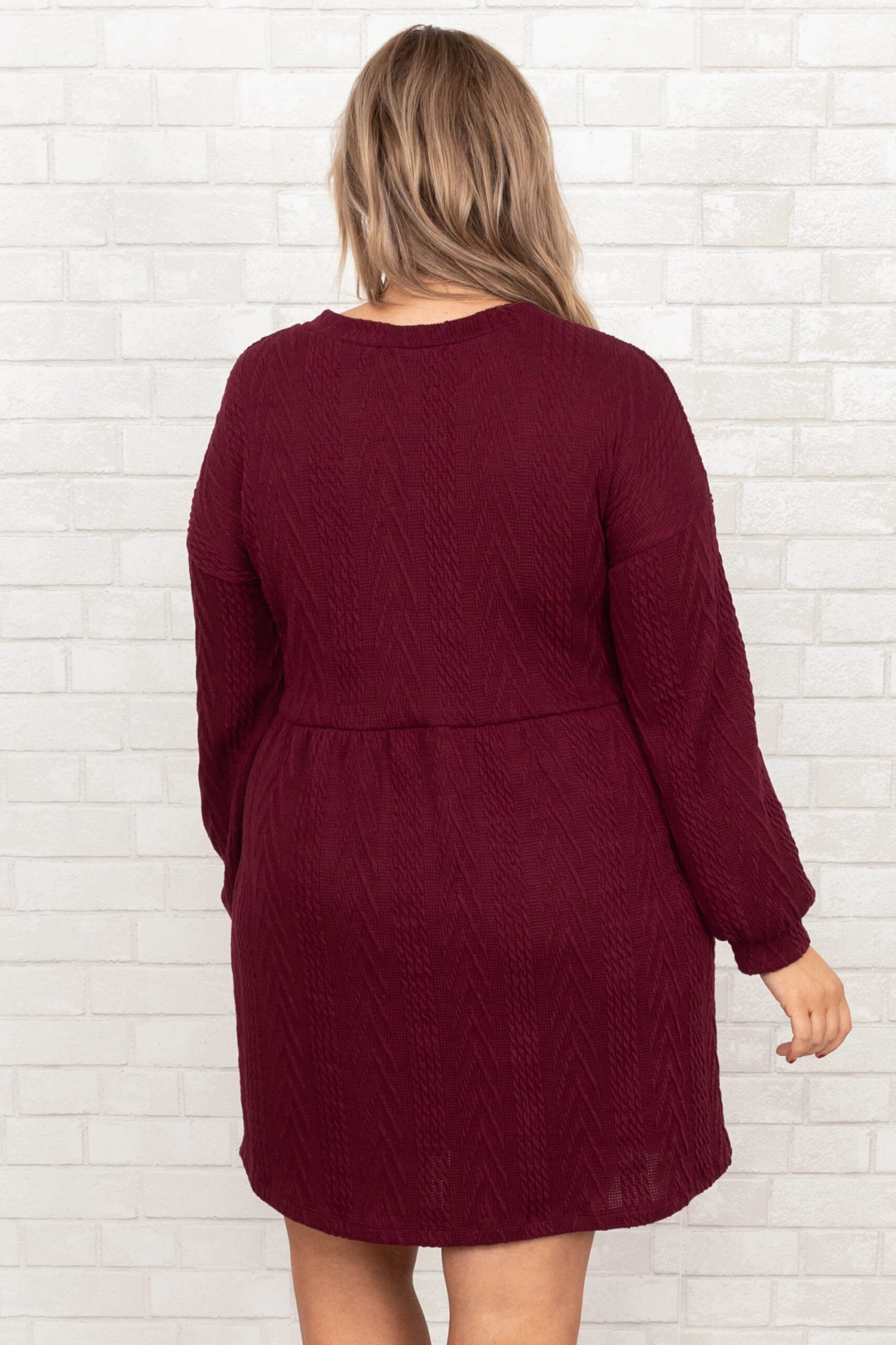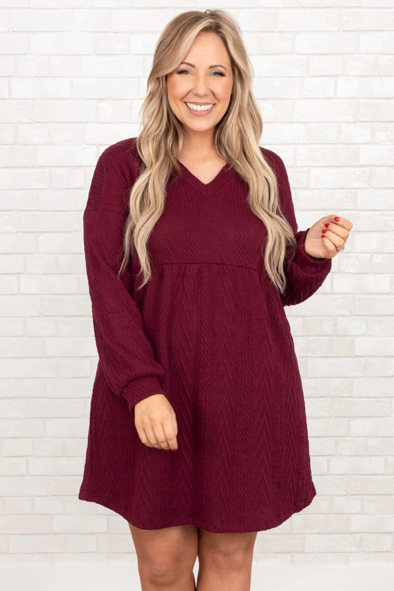Girl, we know you will love this dress! It has a bold wine color and a flattering babydoll fit with a fun cable knit texture. Throw this on with some cute accessories and heels for a unforgettable chic look!