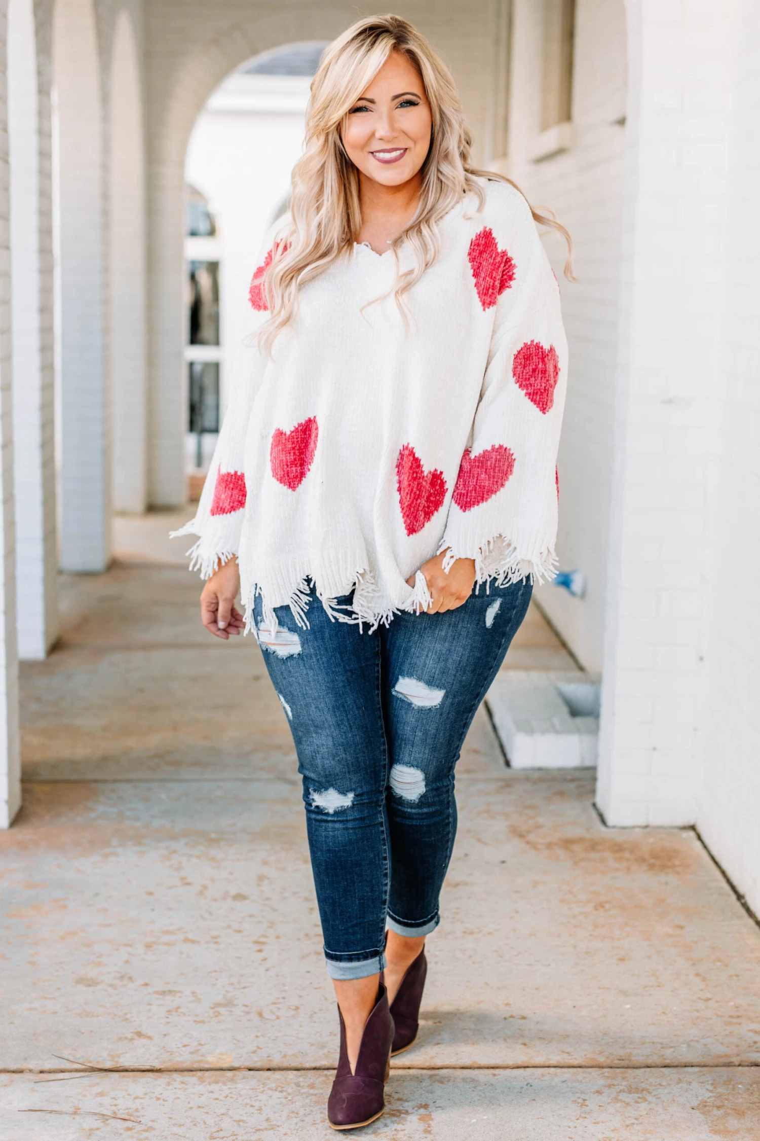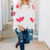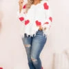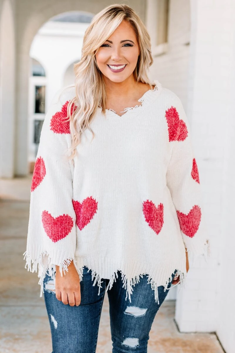 We are giving this sweater all of our love! It has the cutest heart-print pattern with a neutral color you can style for every occasion! It’s comfortable for all day wear, has the softest chenille fabric and features a trendy distressed hemline we absolutely adore! Simply pair this sweater with skinnies and booties for an effortlessly flirty look this season!