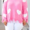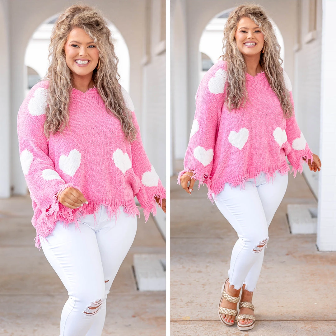 We are giving this sweater all of our love! It has the cutest heart-print pattern with a bold pink color you can style for every occasion! It’s comfortable for all day wear, has the softest chenille fabric and features a trendy distressed hemline we absolutely adore! Simply pair this sweater with skinnies and booties for an effortlessly flirty look this season!Â