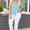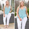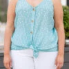 Give us all the sunshine in this amazing tank! The blue color is so beautiful and the material has a satiny soft feel that we just want to dive into! The polka dots are so trendy and the buttons down the front are functional! Style this cutie with some white skinnies and sandals to look oh so chic!