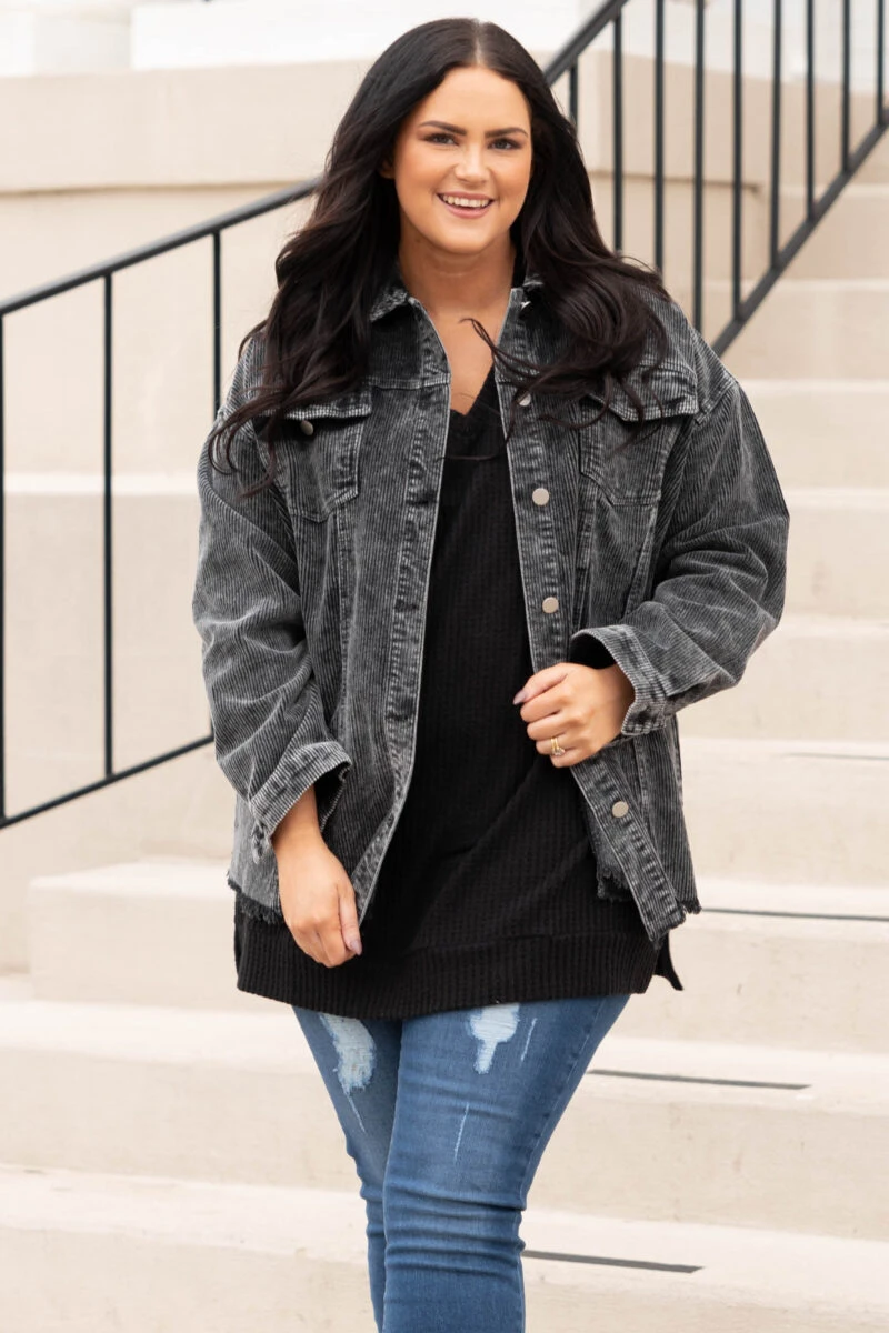 Get a glimpse of you wearing this beauty! This jacket has a neutral black color and a trendy acid wash design that is so fierce! The ribbed texture and distressed hemline is perfect for your new favorite layering piece!