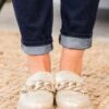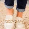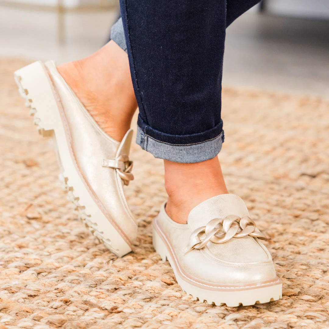 Get ready to step into fall with our Glitter And Gold Mules! These shoes are the perfect slip on and go option, with a chunky chain detail that adds a touch of glamour! Stay on trend and comfortable with these must-have mules!