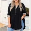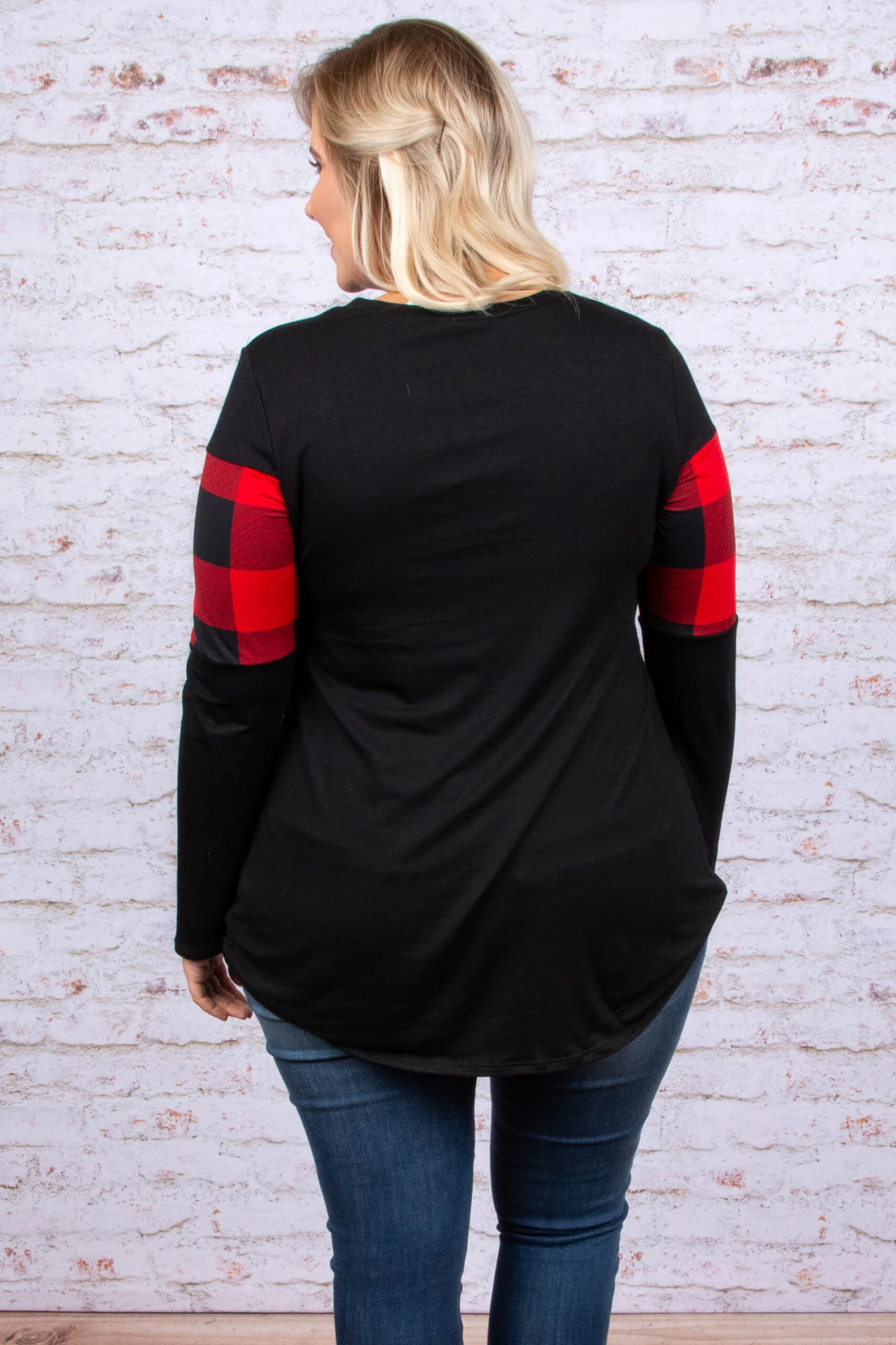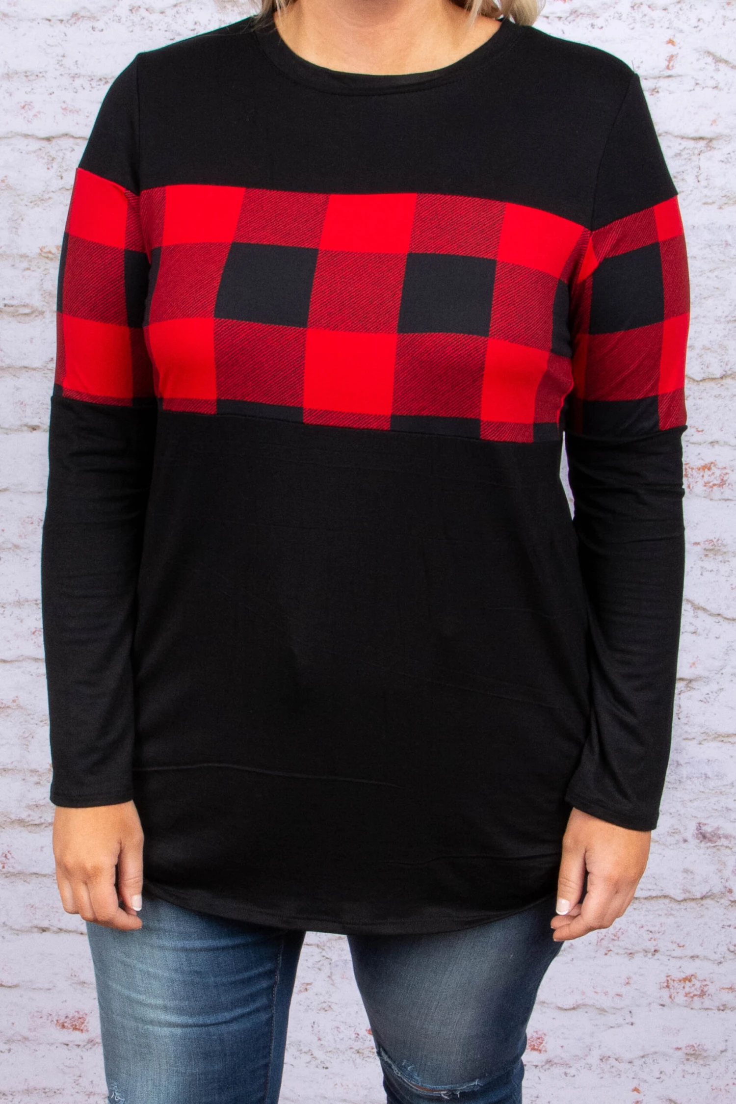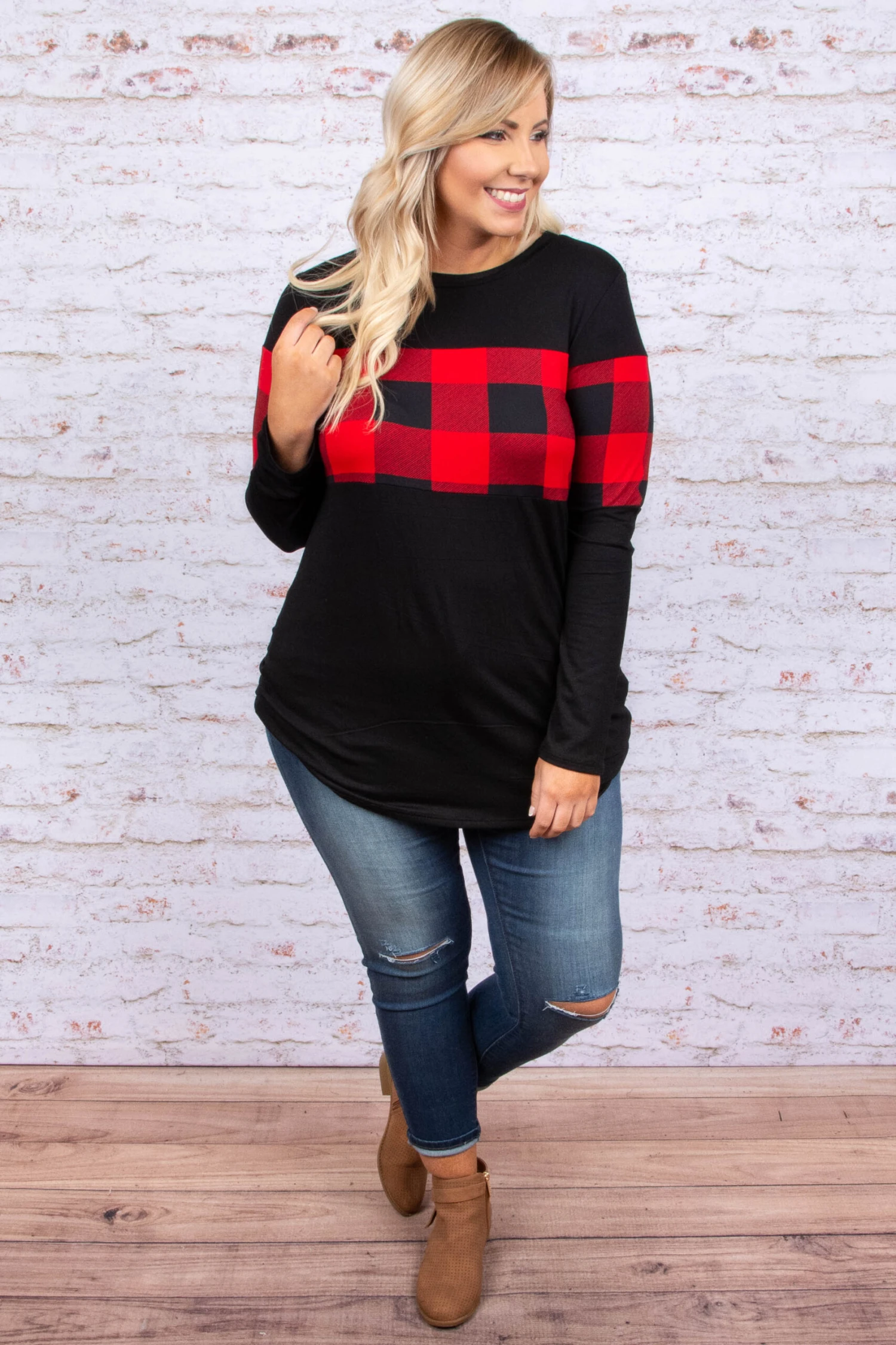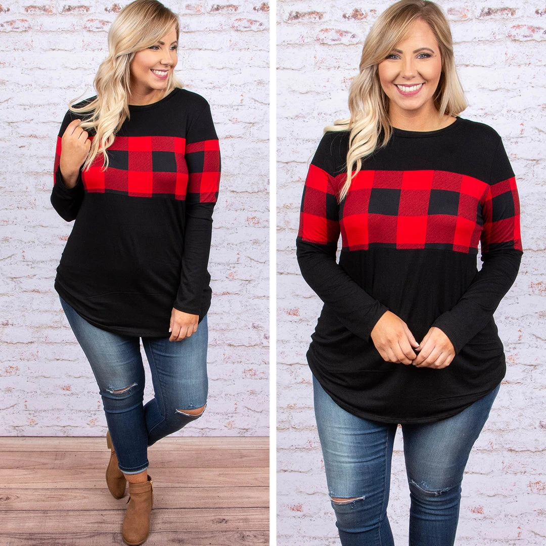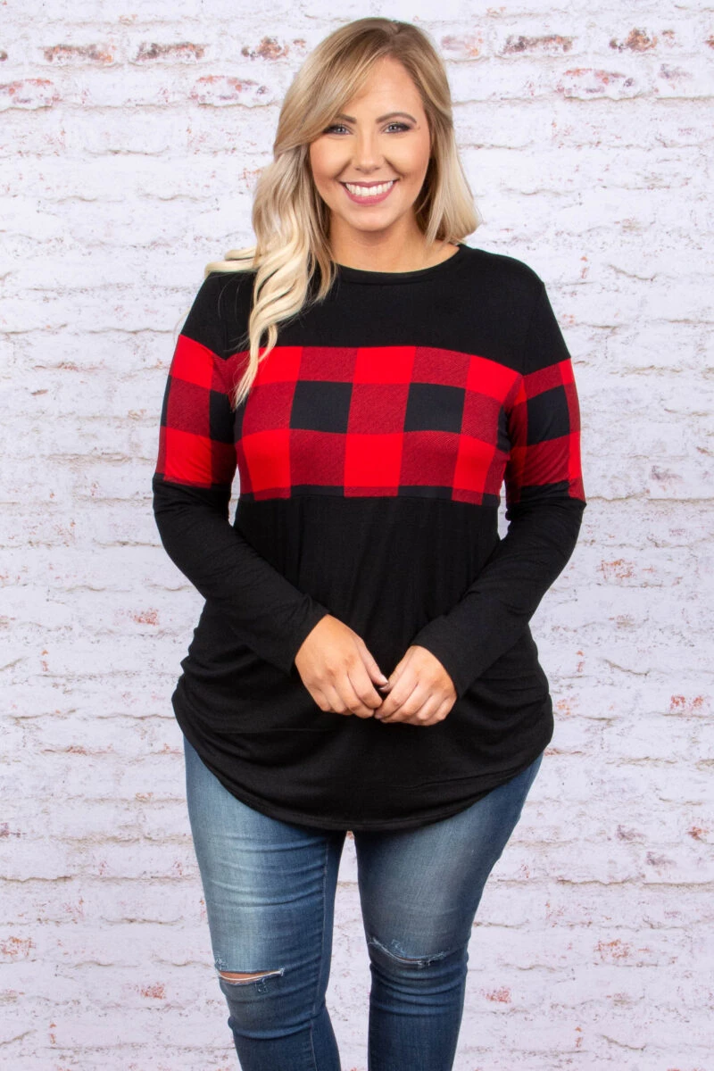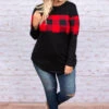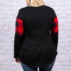 This top is a favorite for winter! It has a solid black fabric paired with a trendy red plaid print! It’s super soft and has a comfy, casual fit! It’s perfect for any outing this season! Throw it on with skinnies and booties for the perfect outfit!