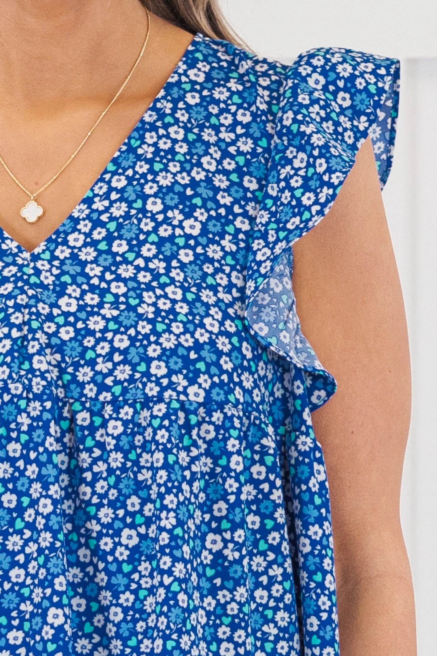 Get ready for some fun in this top! With its flutter sleeves and v-neck, this babydoll silhouette is both playful and flattering! The vibrant royal blue color is complemented by a ditsy floral print, making this top the perfect choice for your next adventure!