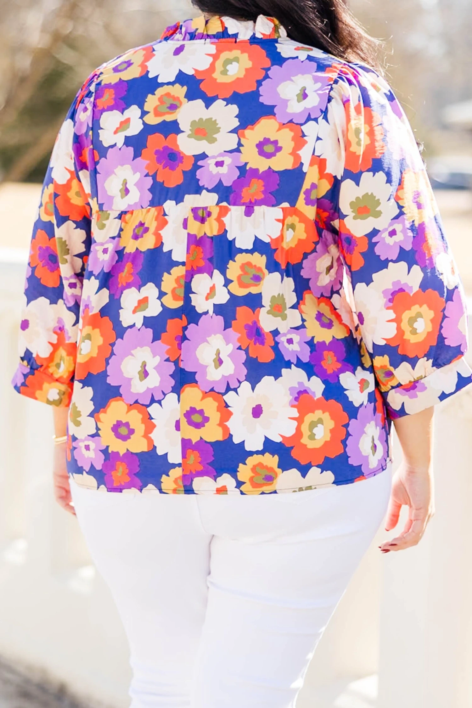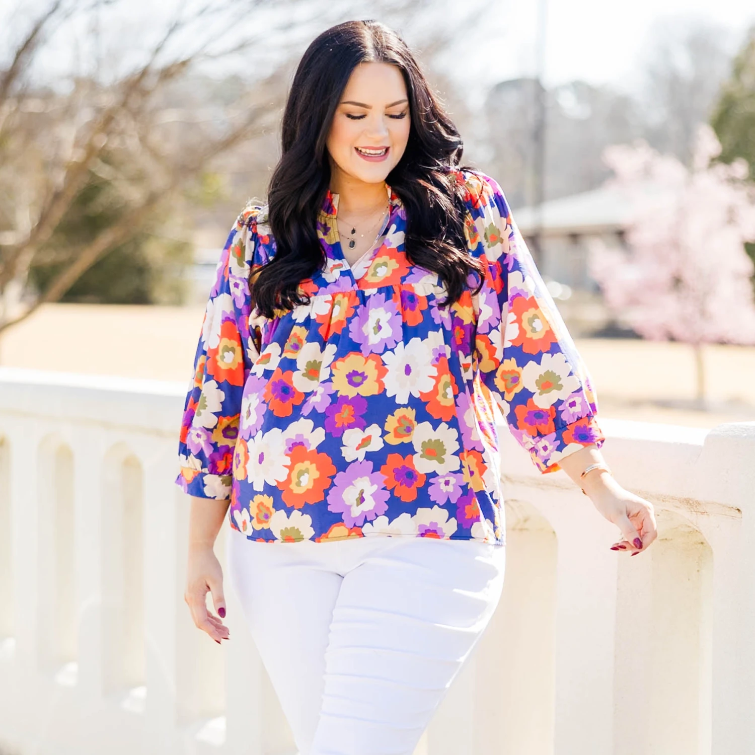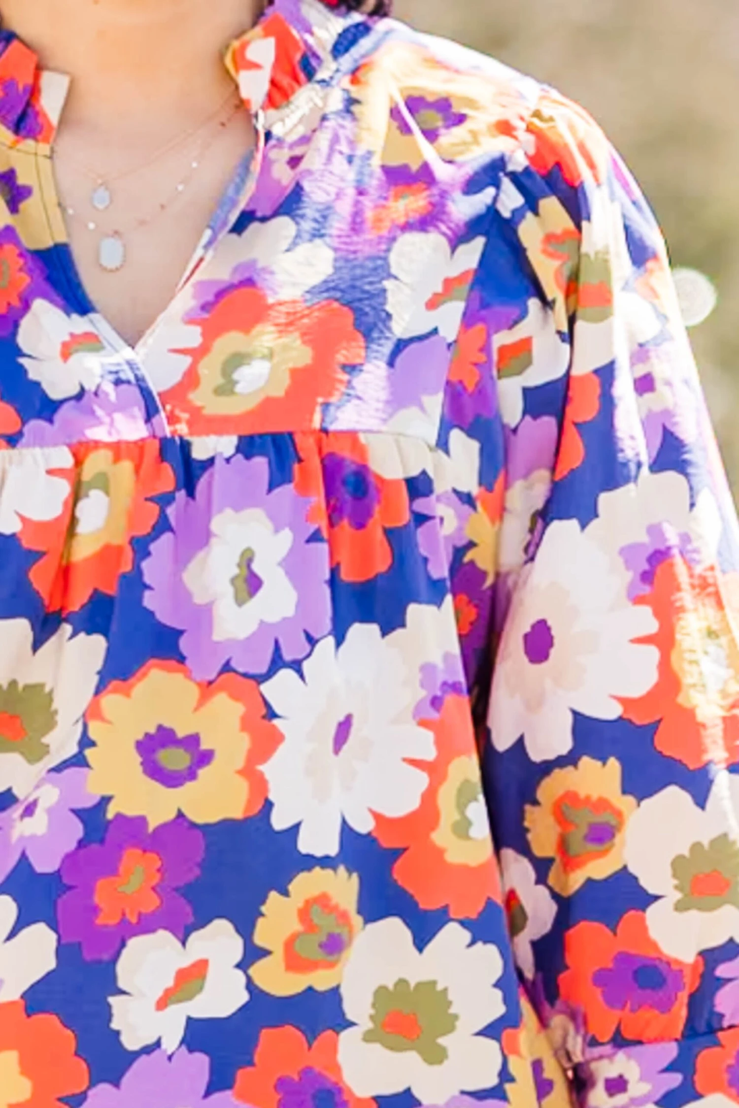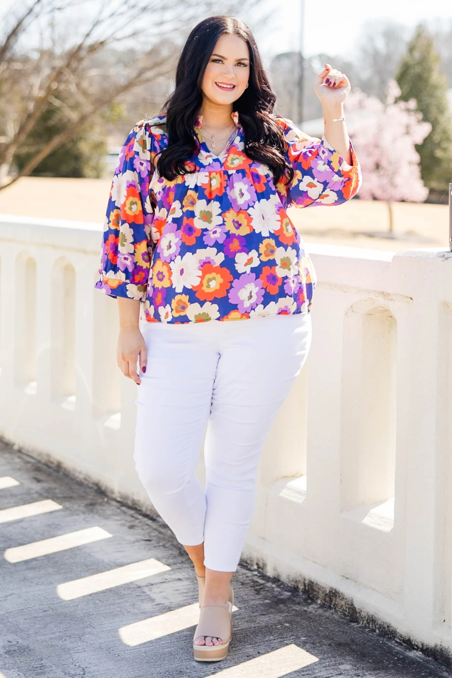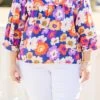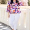 This Gold Coasting Top in Navy-Purple boasts a stunning floral pattern and a flowy fit that exudes effortless style. Pair it with white denim for a chic, versatile ensemble. The beautiful navy and purple color combination adds a touch of sophistication to any look.
