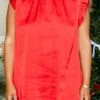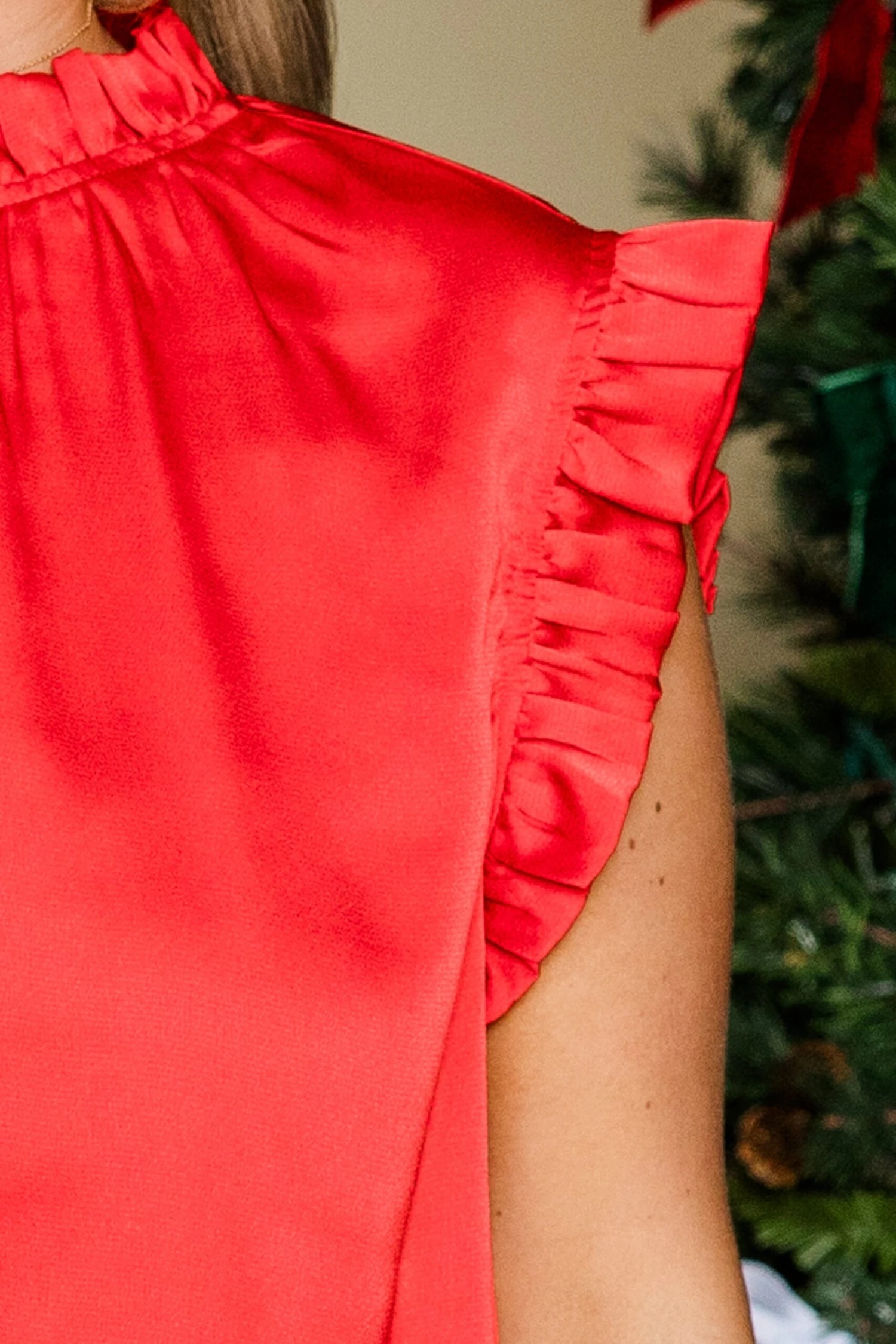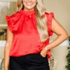 Elevate your style with our Good Luck Babe Top in red! This stunning satin top features a unique round mock neckline with beautiful ruffle detail on the sleeves and neckline. Perfect for any occasion, you’ll feel confident and stylish in this top.