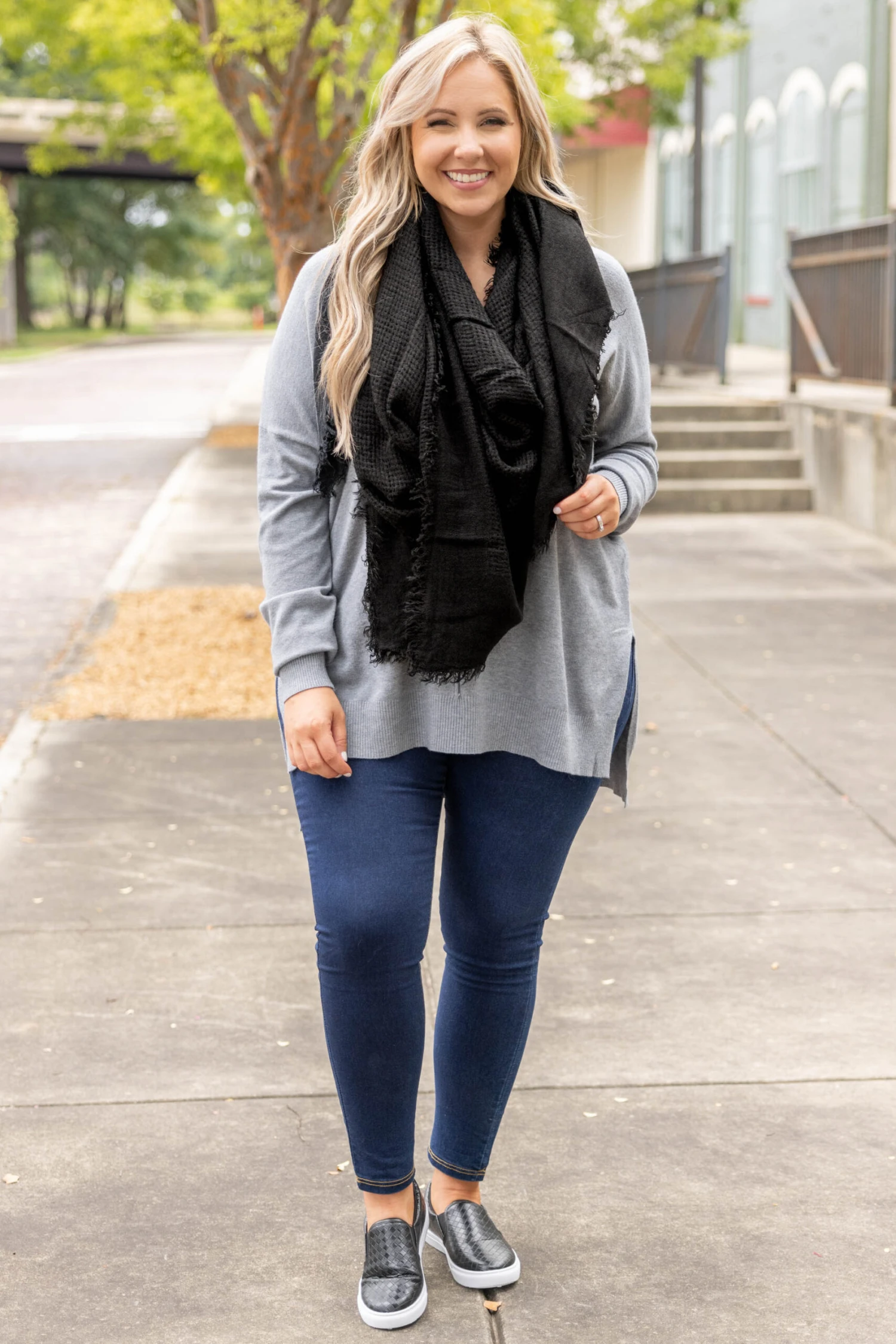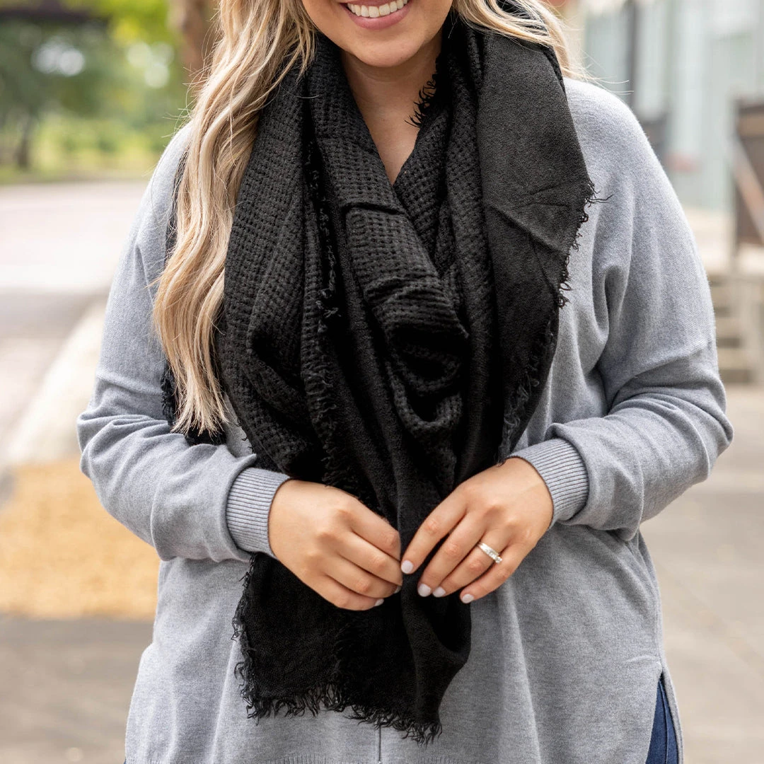 We simply LOVE this fabulous scarf! This scarf has a neutral black color and a frayed hemline that is so sweet! Simply style this scarf with a cute top and skinnies for a casual, cozy look!