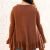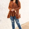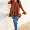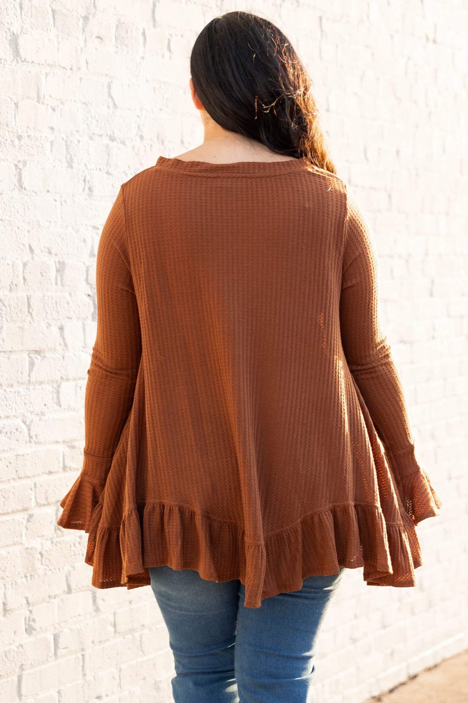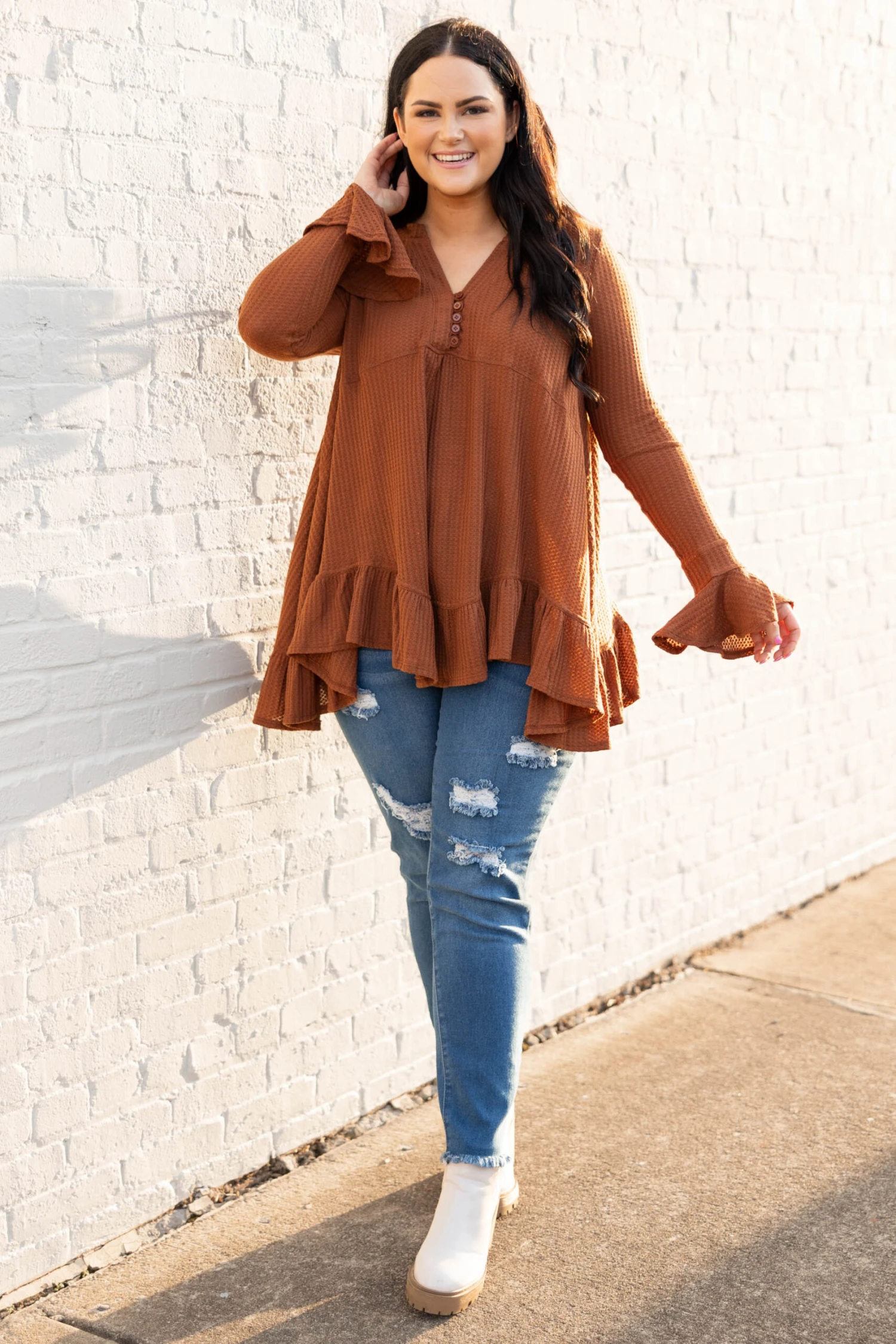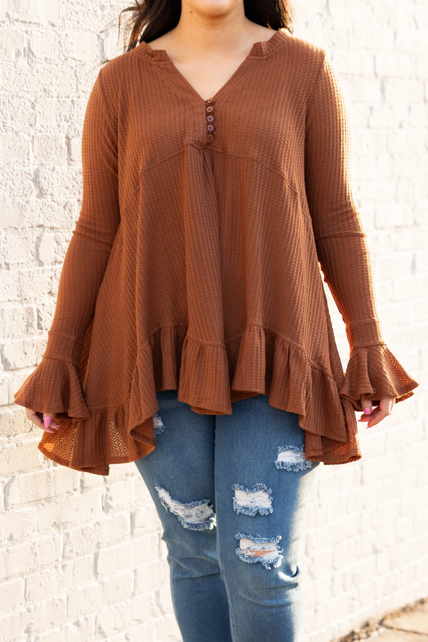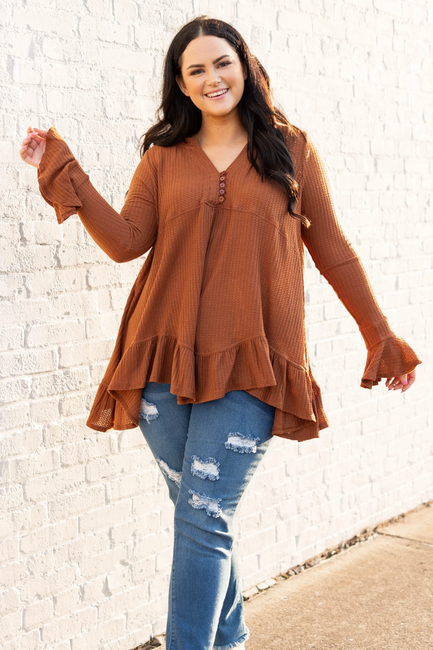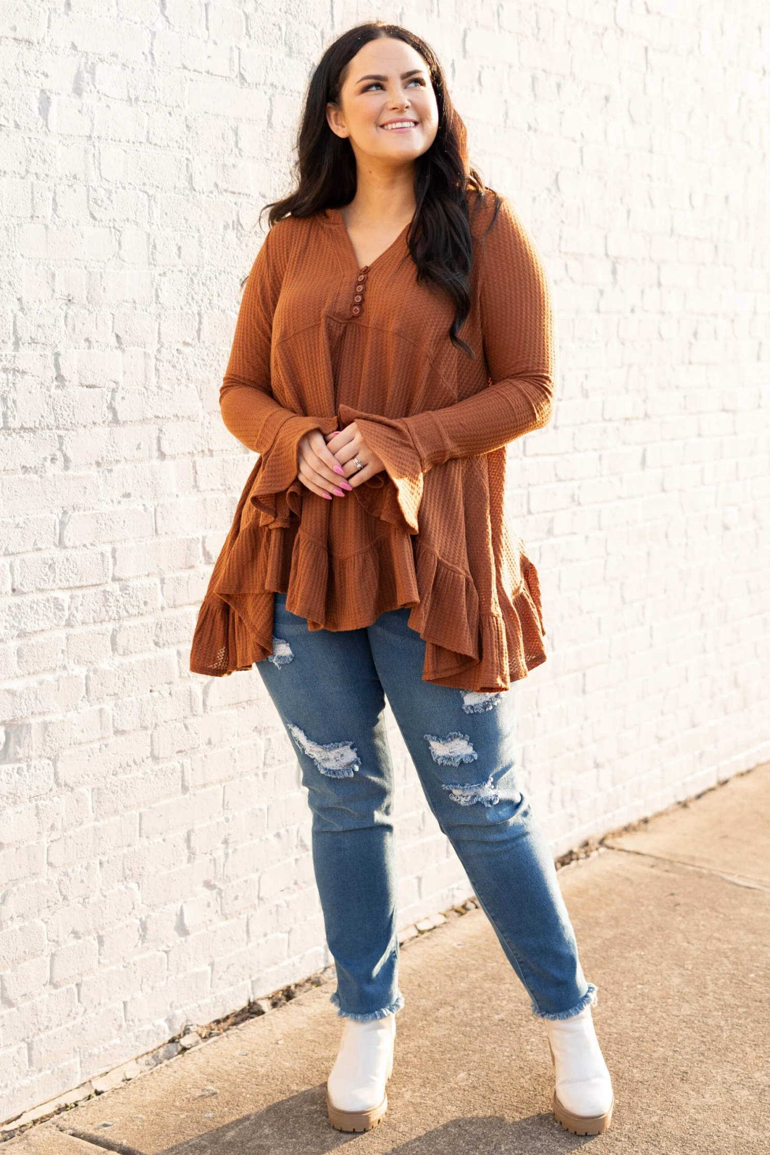You will feel happier than ever wearing this fab new tunic! It features a soft waffle knit fabric, a sweet babydoll fit and ruffles on the wrist and hem. You can pair this cinnamon top with jeans and booties for a fun look!