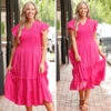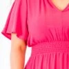 Introducing the Happy To Be Me Dress in a stunning fuchsia shade! Featuring a smocked waistline and functional pockets, this dress enhances your figure with a flowy fit and perfect midi length! Complete the look with cute accessories and heels for a gorgeous ensemble!