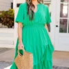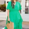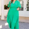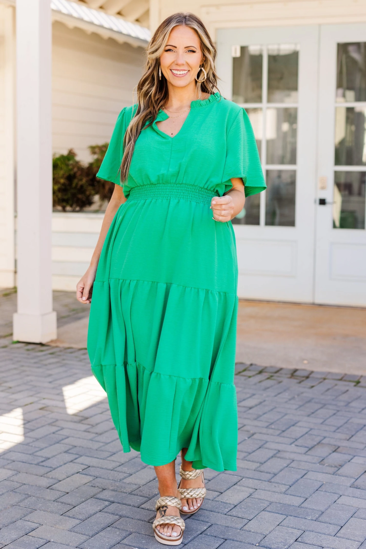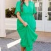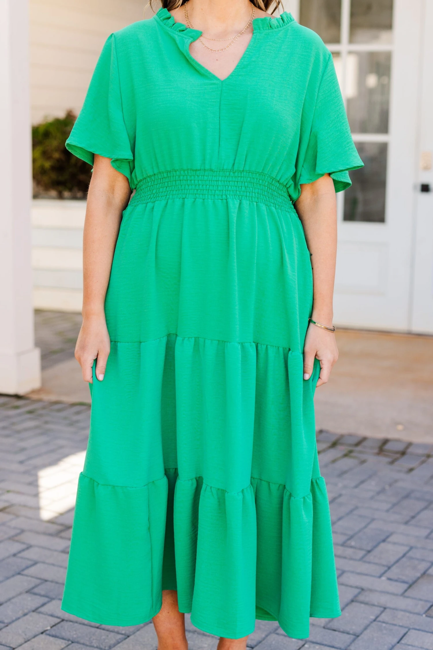 Introducing the Happy To Be Me Dress in a stunning green shade. Featuring a smocked waistline and functional pockets, this dress enhances your figure with a flowy fit and perfect midi length! Complete the look with cute accessories and heels for a gorgeous ensemble!