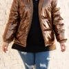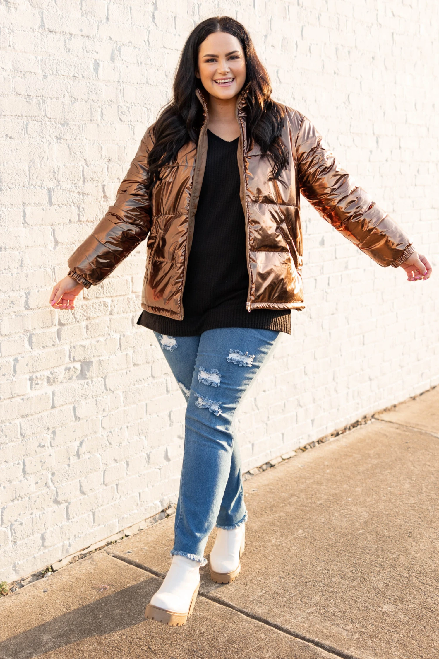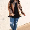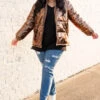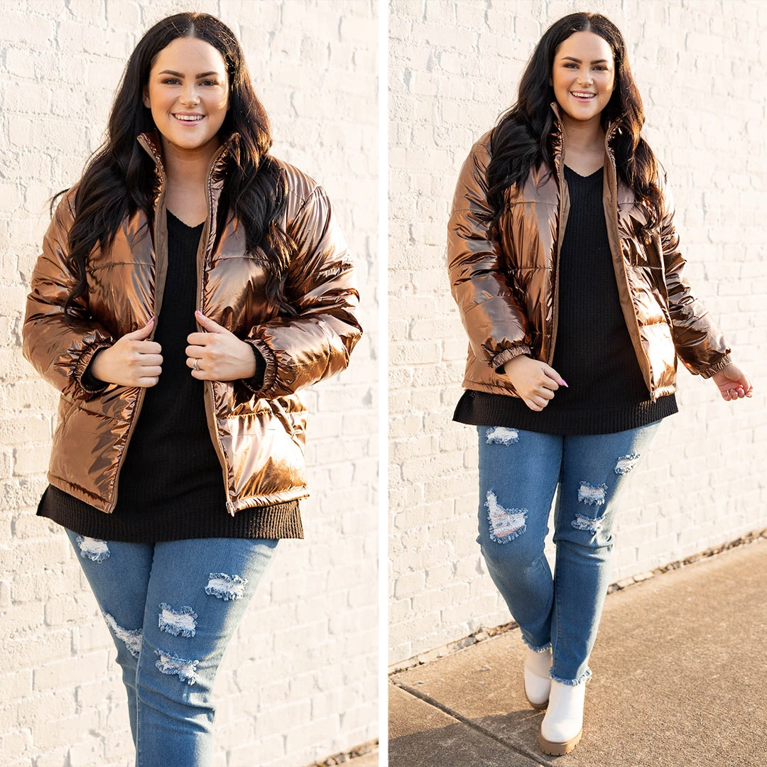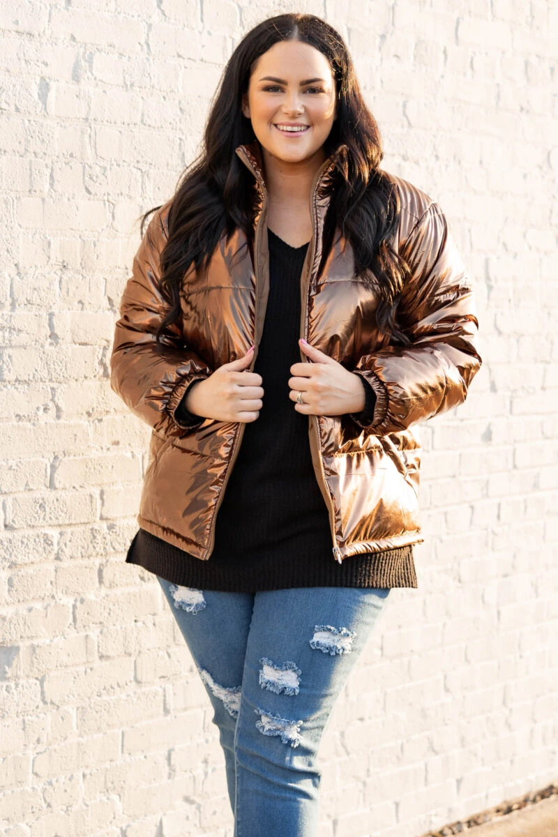 This jacket is so much fun! It has a lovely brown color with a metallic design that is super trendy and sweet! The cozy, flattering fit is perfect for those cold days ahead this season! Layer this fun jacket over all of your faves for an unforgettable look!