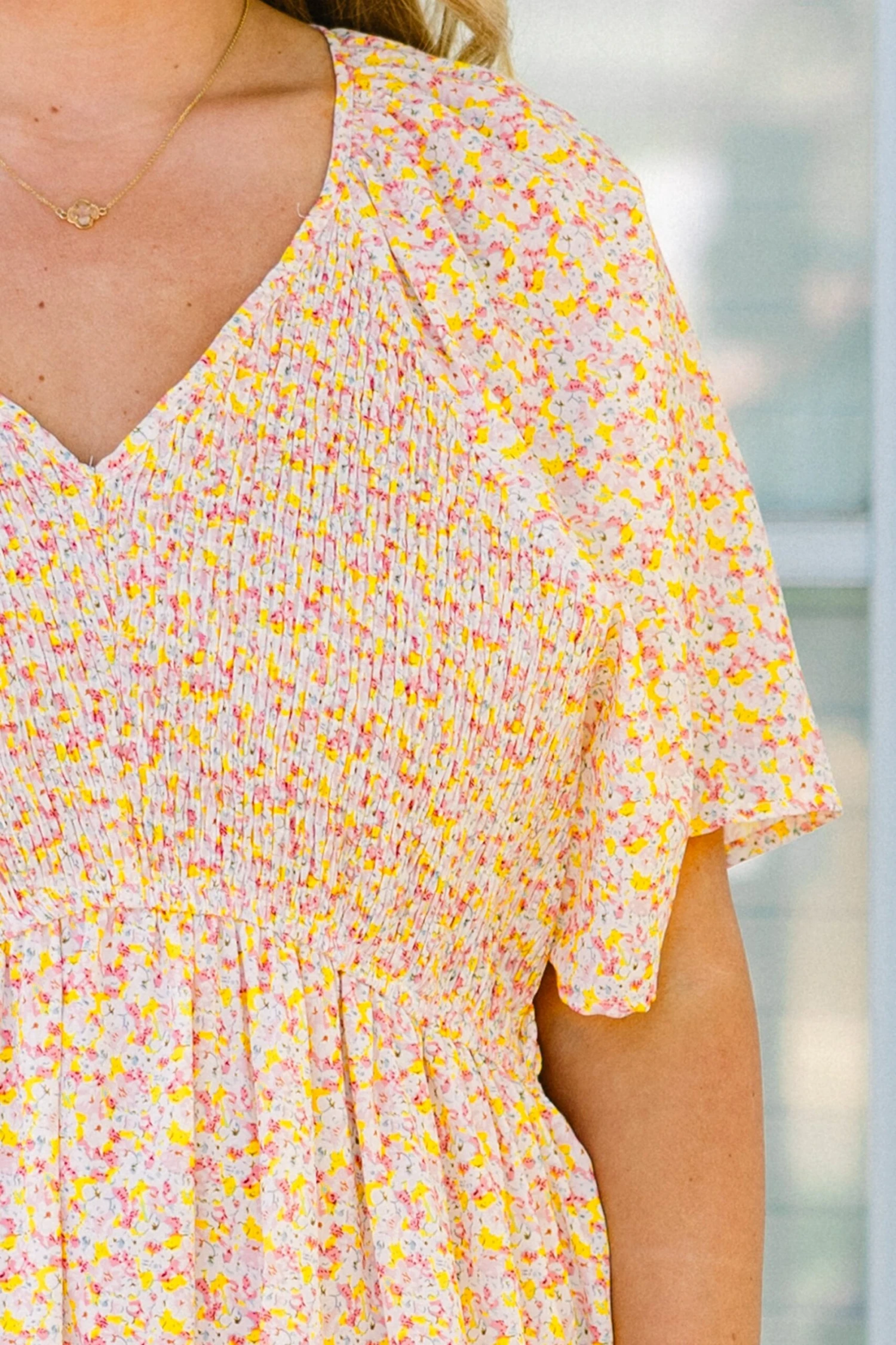 Upgrade your wardrobe with this dress in pink! Featuring a charming ditsy floral print, an elastic waist for a flattering fit, and a keyhole button closure on the back! The flowy drop sleeve and tiered skirt give it a romantic feel, while functional pockets and a smocked front bust add practicality! Perfect for a day out or special occasion!
