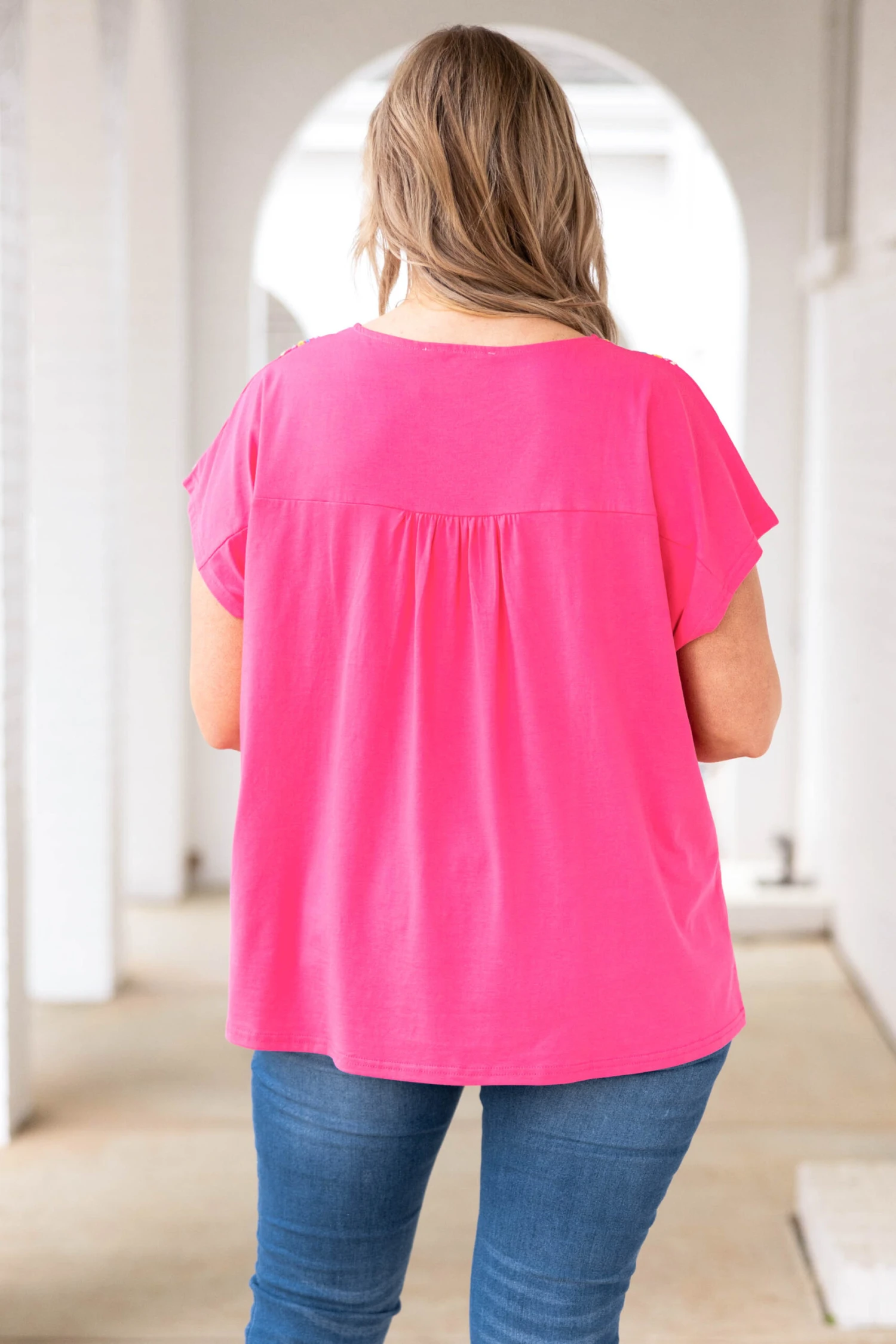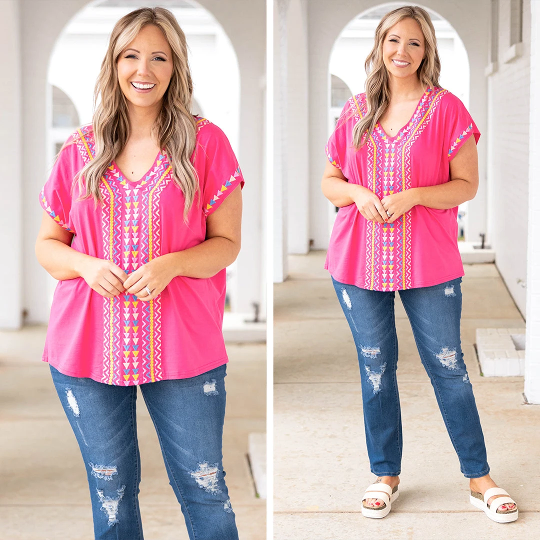 We are saying that you don’t want to miss out on this lovely top! The bold hot pink color with the sweet embroidered design is a season fave! The stretchy, figure flattering fit is just what you need to flatter the crowd and feel comfy all day long! Style this top with distressed skinnies and sandals for a classic chic look!