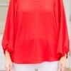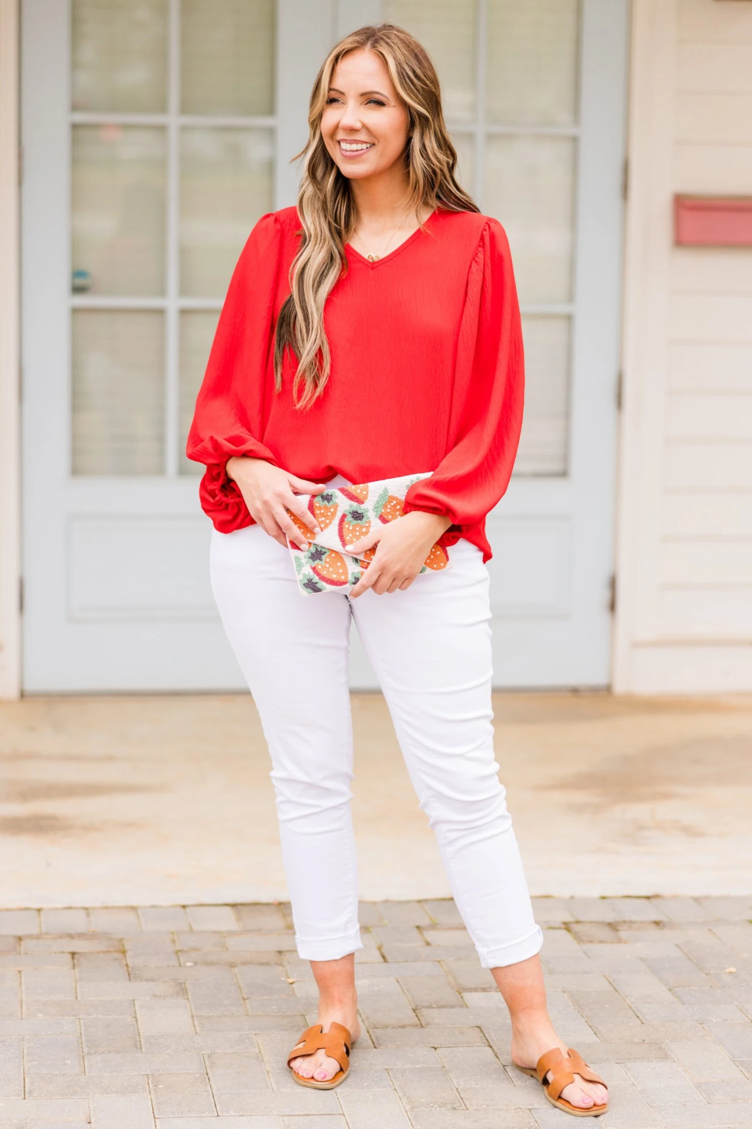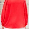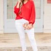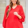 Add a pop of bold color to your wardrobe with this breathtaking top! The bold red color, flirty bubble sleeves, and flowy fit create a playful yet sophisticated look! Pair it with patterned pants or white denim for a versatile and stylish ensemble!