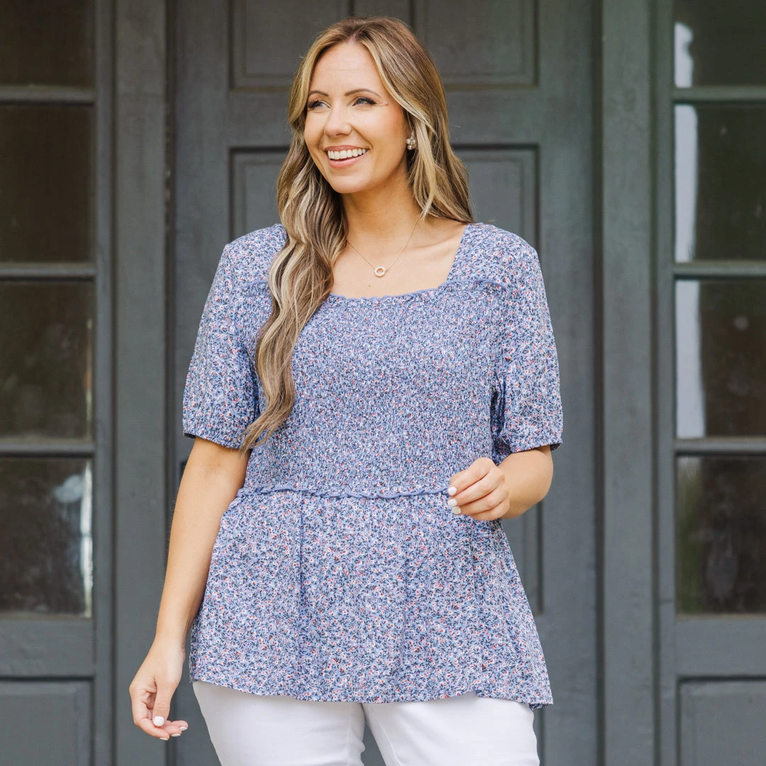 This gorgeous top features a smocked bodice and ruffle detailing, giving it a flattering and feminine look! The beautiful blue color and floral pattern add a touch of elegance to any outfit! With its comfy fit and eye-catching design, this top is sure to become a staple in your wardrobe!