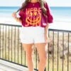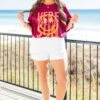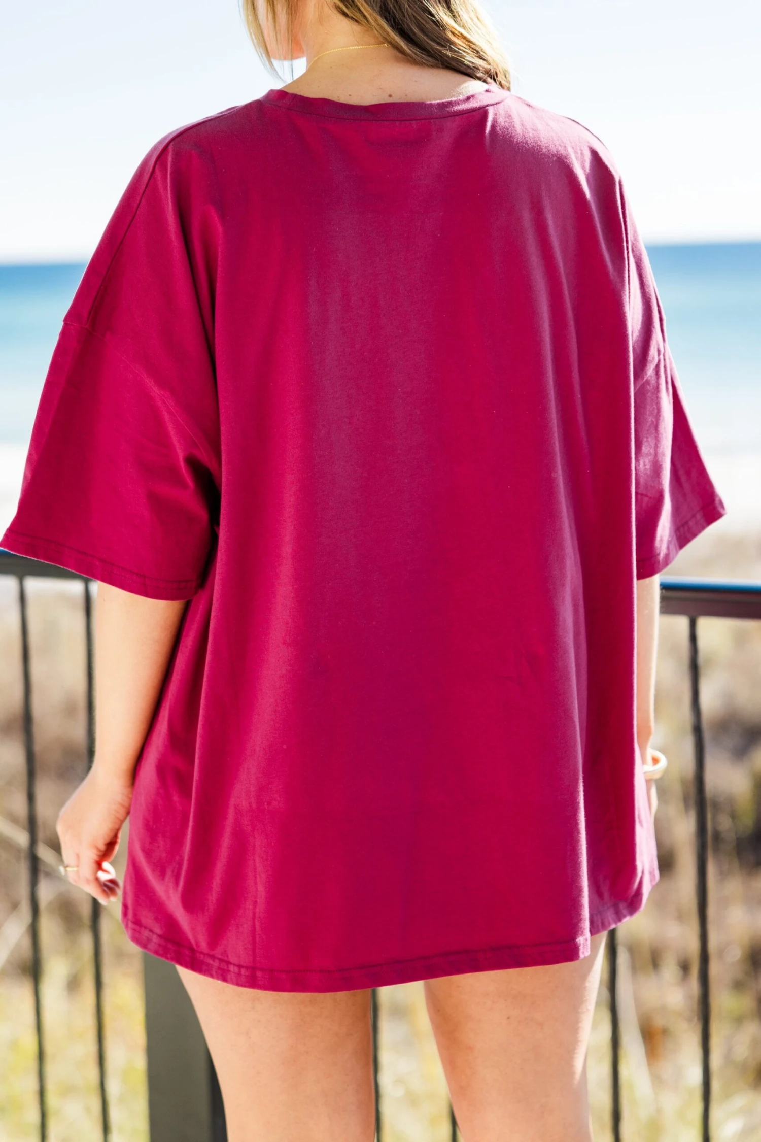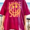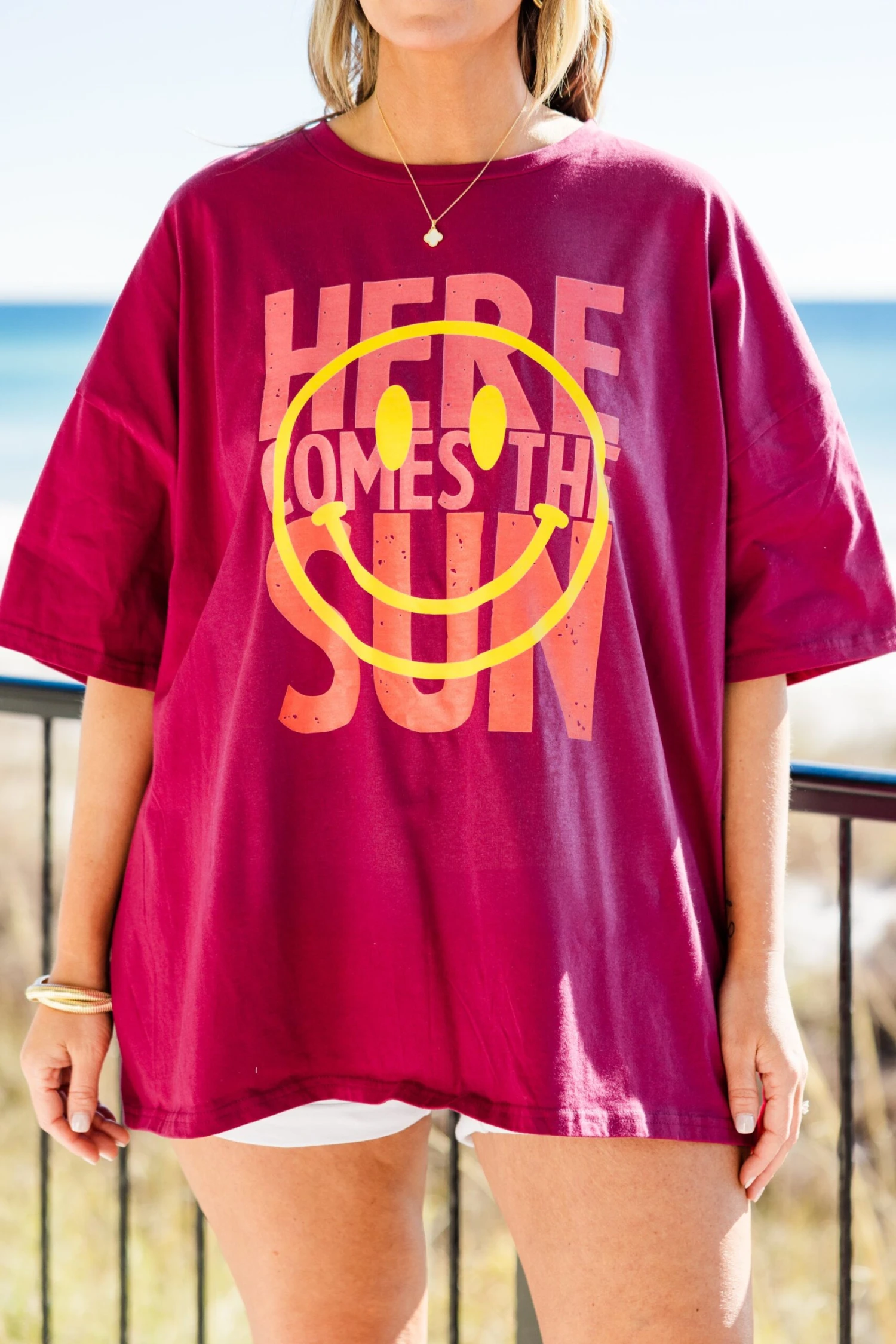 Express your sunny personality with the Here Comes the Sunshine Boyfriend Tee! This magenta oversized boyfriend tee features a fun smiley face graphic that is sure to bring a smile to your face! Made with comfort in mind, this tee is perfect for a casual, relaxed look!