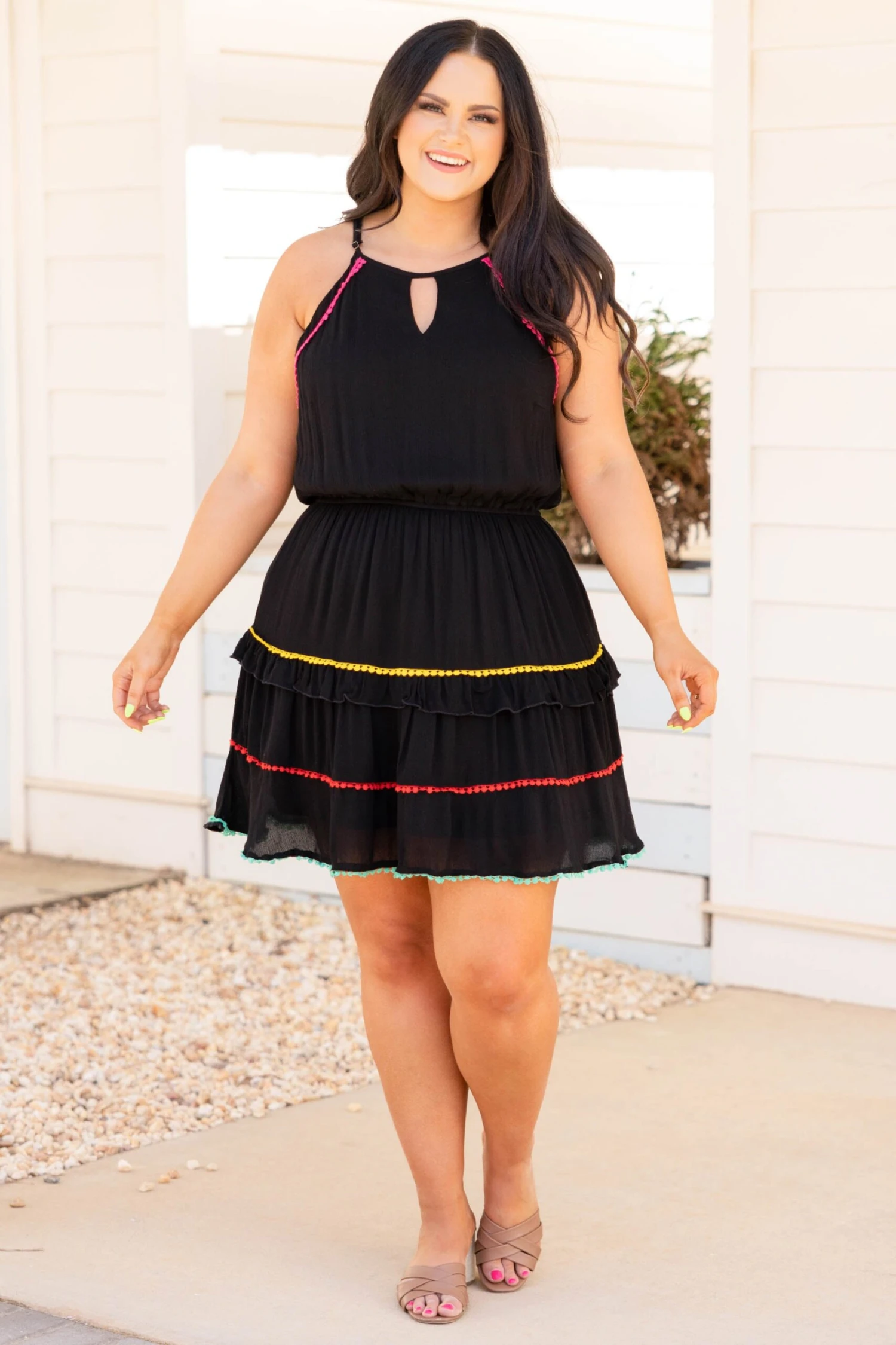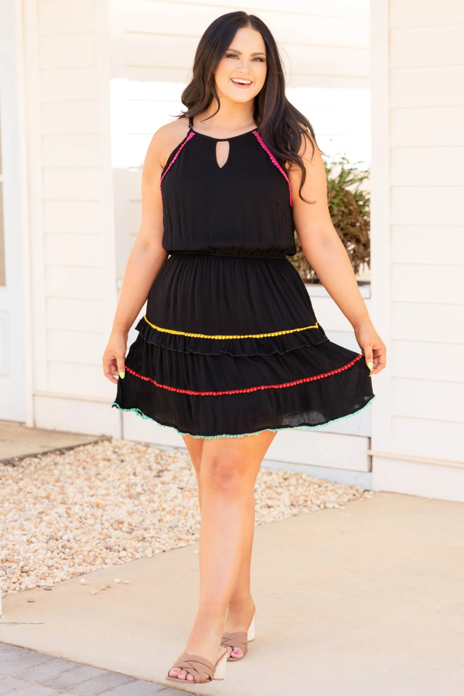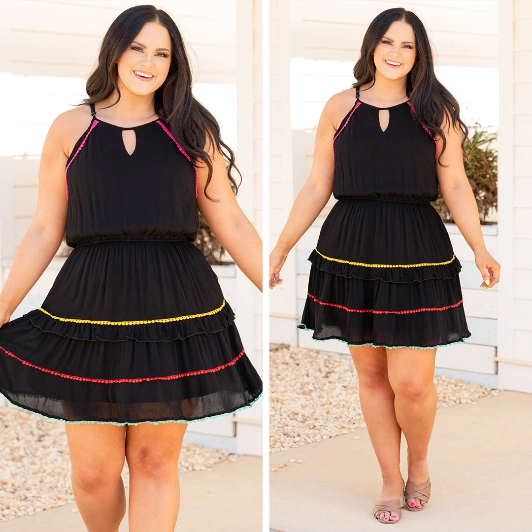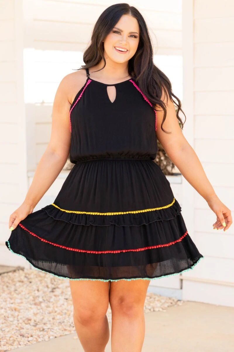 We are here for how much we love this dress! The black makes the multi color detailing pop and the cinched waist is so flattering! The halter style is so in right now and will have you looking so fab! Style this with some heels and fun accessories for a cute look!