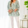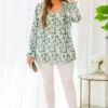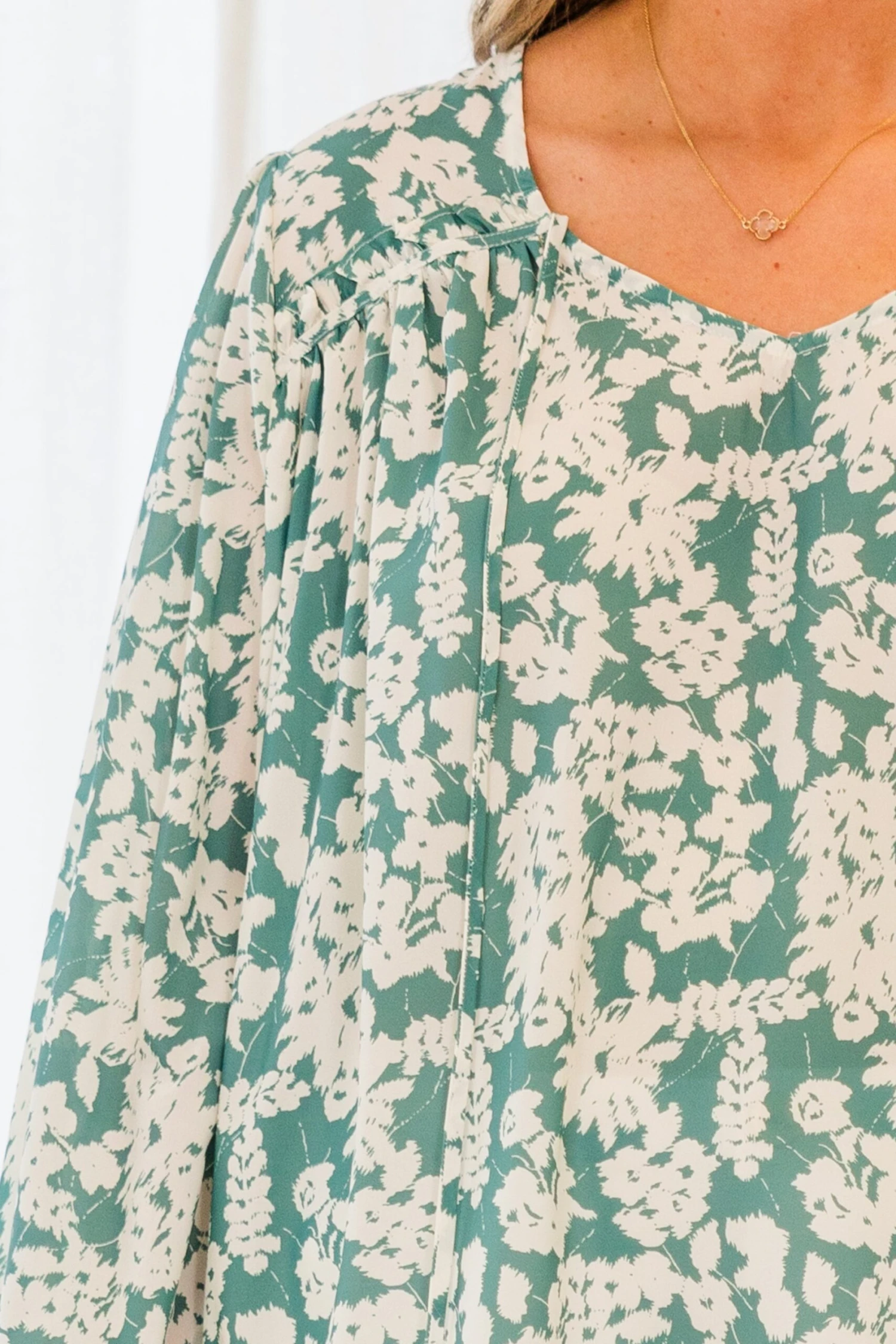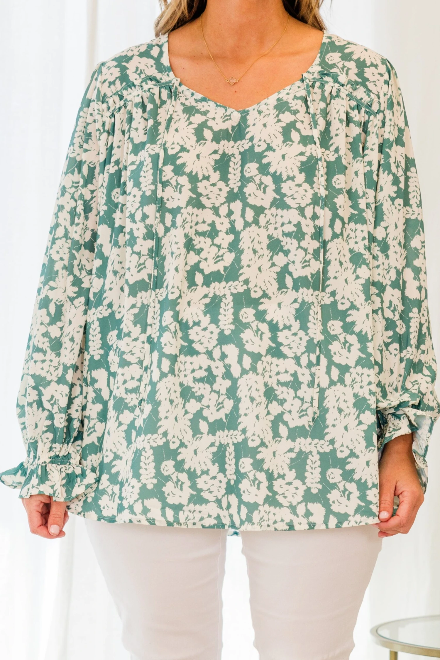 Take your wardrobe to new heights with the addition of this beauty! This elegant top features a charming ruffle detail along the sleeve hemline and a lovely teal color! The delicate floral pattern adds a touch of femininity, making it perfect for a day at the office or a casual day out!