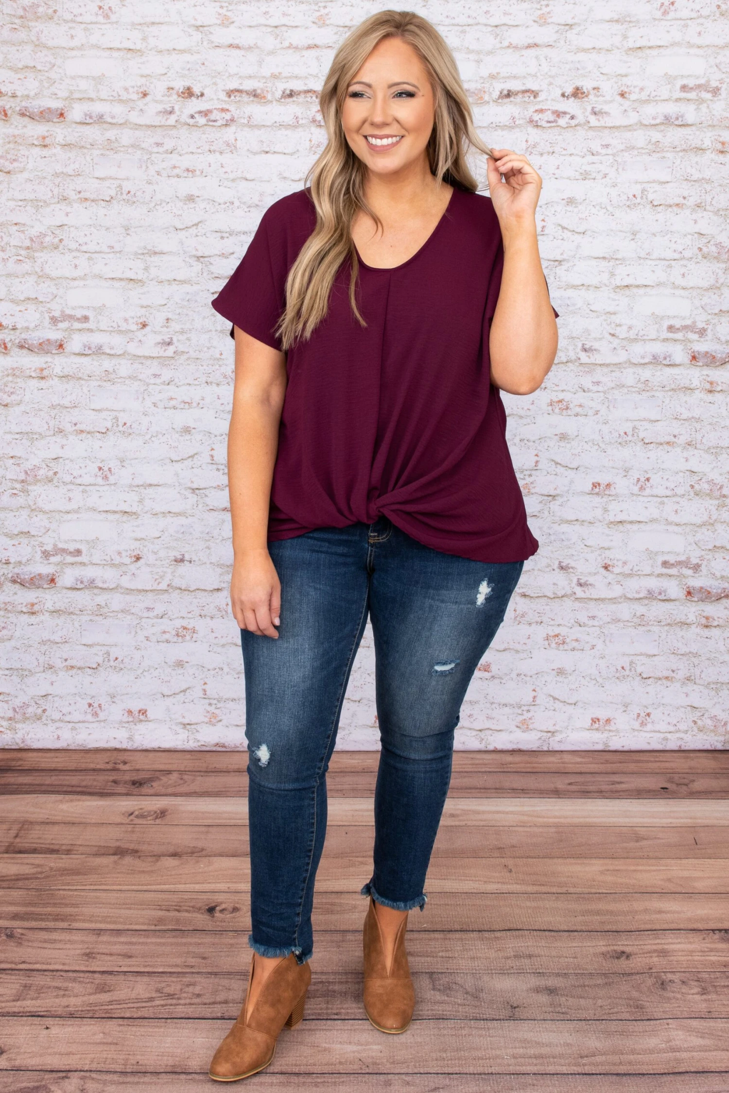 We could not heart this blouse more! This blouse has a solid sweet color you can dress up or down and style for every occasion! It’s comfortable for all-day wear, has a figure-flattering fit, and can be paired with your favorite shoes and accessories! Simply, wear this blouse with skinnies and wedges for an effortlessly chic look!Â