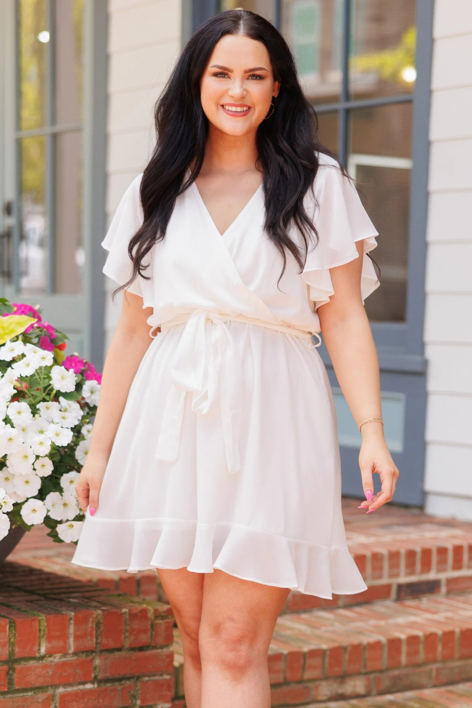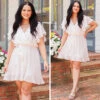 This is the dress you’ll want to hold on to forever! It has a solid white color you can dress up or down for every occasion! It has a faux-wrap design with a removable tied waistline to flatter your figure and even features the cutest flutter sleeves – perfect for the season! Simply pair this dress with wedges or heels for an effortlessly chic look!Â