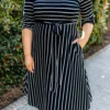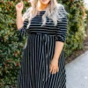 Hold hands with your love when you’re wearing this dress! This dress has the prettiest stripe pattern with a soft black color you can style for every occasion! It’s comfortable for all day wear, has a tied waistline to flatter your figure, and even features pockets! Simply style this dress with heels or wedges for your next date night!Â